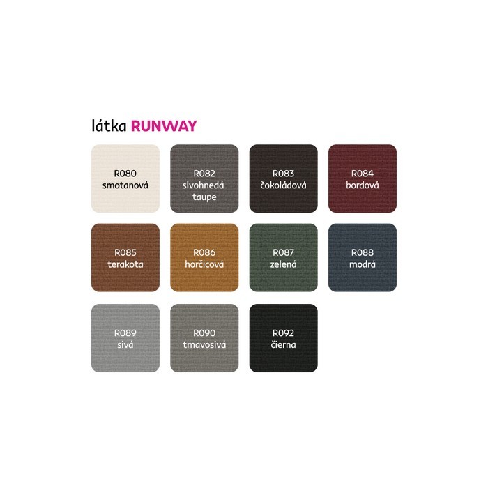 Možnosť objednania v 11 farebných prevedeniach látky Runway. Pri individuálnej objednávke je potrebné zaplatiť 20 % zálohu z danej sumy. Po uhradení zálohy bude Vaša požiadavka zadaná do výroby. Dodacia lehota 6 - 8 týždňov.