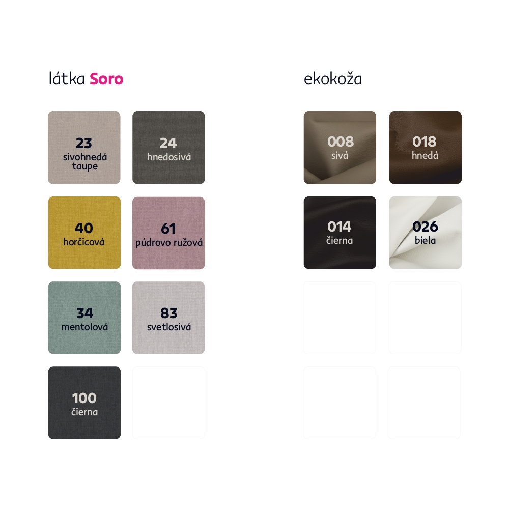 Možnosť objednania v 4 farebných prevedeniach ekokože a v 7 farebných prevedeniach látky Soro v cene 1.159 eur. Svoj výber poznačte do poznámky v objednávke. Pri individuálnej objednávke je potrebné zaplatiť 20% zálohu z danej sumy. Po uhradení zálohy bude Vaša požiadavka zadaná do výroby. Dodacia lehota 6-8 týždňov.