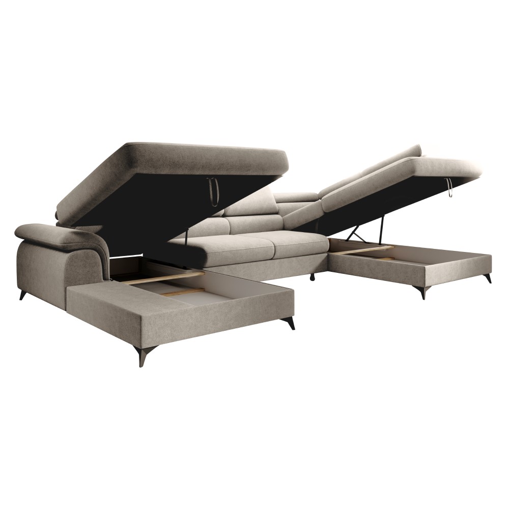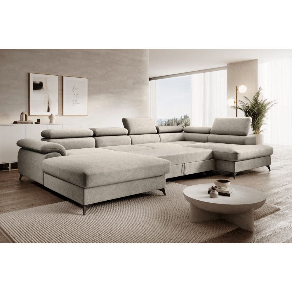 Hľadáte veľkú, pohodlnú a modernú sedaciu súpravu. Rohová sedačka POLY ROH U splní všetky vaše očakávania. S rozmermi (ŠxHxV) 350x205x75/95 cm poskytuje dostatok priestoru na relax aj sedenie pre celú rodinu. Je čalúnená kvalitnou látkou Whisper 02 v béžovej farbe, ktorá sa pýši vysokou oderuodolnosťou až 100 000 cyklov podľa testu Martindale, takže vydrží aj intenzívne každodenné používanie. Sedačka je pravé prevedenie a má tvar do U, čo z nej robí ideálny prvok pre väčší obývací priestor. Disponuje funkciou rozkladu, vďaka ktorej získate plnohodnotnú plochu na spanie s rozmerom 125x263 cm. Pohodlie pri opretí zabezpečuje až šesť polohovateľných opierok hlavy, ktoré môžete nastaviť v piatich stupňoch. Pohodlie sedenia podporuje kombinácia pružiny falista a PUR peny, výška sedu je 43 cm, hĺbka sedu 58 cm a šírka medzi oboma otomanmi 130 cm. Menší otoman má šírku 110 cm, väčší 114 cm, výška chrbtovej opierky dosahuje 52 cm. Samozrejmosťou je aj úložný priestor ukrytý v otomane, kam pohodlne odložíte deky, vankúše alebo posteľnú bielizeň. Sedačka stojí na čiernych kovových nožičkách s výškou 10,5 cm, ktoré jej dodávajú stabilitu a zároveň umožňujú jednoduché upratovanie pod ňou. Vďaka celočalúnenému prevedeniu sa skvele vyníma aj voľne v priestore. Dodáva sa v demonte.