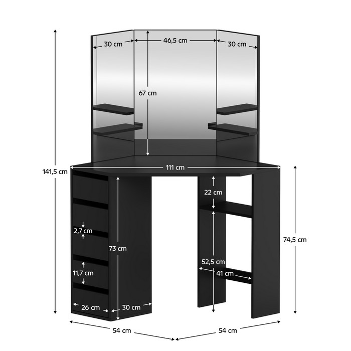 Rohový toaletný stolík ELIO je ideálnou voľbou pre každého, kto chce spojiť úsporu miesta s dostatkom úložného priestoru. Vďaka rohovému prevedeniu efektívne využíva priestor a pri rozmeroch (ŠxHxV): 111x54x141,5 cm vytvára komfortnú plochu na každodenné líčenie či úpravu vzhľadu. Elegantné čierne prevedenie a čisté línie podčiarkujú jeho moderný charakter. Vyrobený je z laminovanej MDF s hrúbkou 1,6 cm, čo zaručuje pevnosť a stabilitu. Dominantným prvkom je trojdielne zrkadlo, ktoré umožňuje pohodlný pohľad z viacerých uhlov. Bočné police s nosnosťou 10 kg poskytujú praktické miesto na vystavenie kozmetiky či dekorácií. Úložný priestor dopĺňajú zásuvky s rozmermi (ŠxV): 26x11,7 cm a nosnosťou 15 kg, do ktorých jednoducho uložíte všetko potrebné. Otvorená časť pod doskou ponúka ďalší priestor na veci, ktoré chcete mať rýchlo poruke. Pomôže vámvytvoriť elegantný a funkčný kozmetický kútik presne podľa vašich predstáv. Pre väčšiu bezpečnosť odporúčame stolík pripevniť k stene. Dodáva sa v demonte.