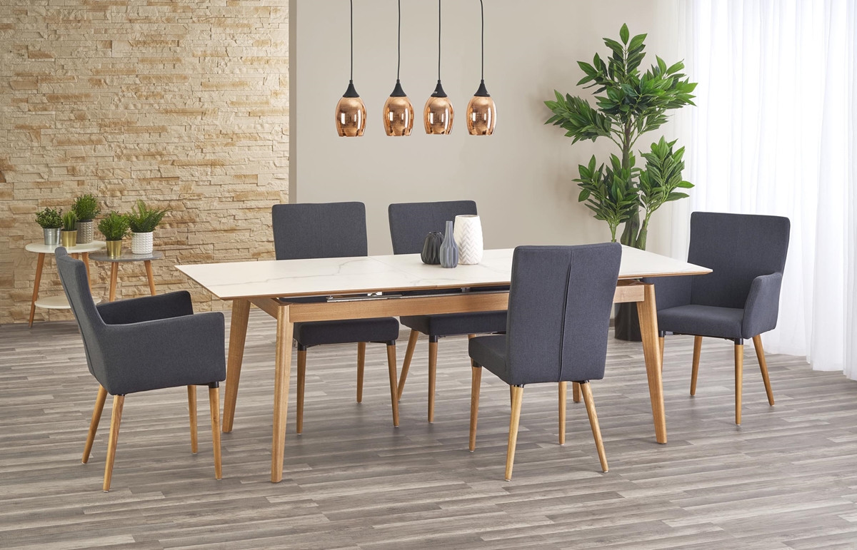 Rozkladací jedálenský stôl MONTREAL je zhotovený z keramickej dosky a masívneho dreva, čo mu dodáva minimalistický vzhľad. Nohy sú v dekore jaseň, doska je biela so vzorom. Rozmery stola sú (ŠxHxV): 180-220x90x76 cm. Stôl možno jednoducho rozložiť na šírku 220 cm a zložiť na šírku 180 cm. Za stôl Montreal možno pohodlne usadiť 6 osôb v zloženom stave a 8 osôb v rozloženom stave.