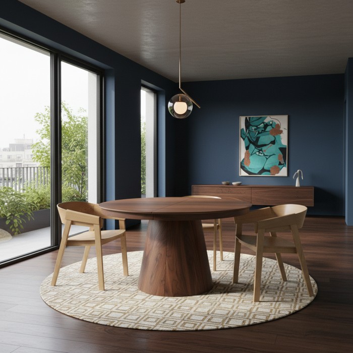 Rozkladací jedálenský stôl NANET predstavuje ideálne spojenie elegantného dizajnu a vysokej funkčnosti pre moderné bývanie. Vrchná doska je vyrobená z laminovanej MDF v dekore orech, ktorý pôsobí nadčasovo a ľahko sa kombinuje s rôznymi štýlmi interiéru. V základnom stave má stôl okrúhly tvar s rozmermi (ŠxHxV): 115x115x75 cm a je vhodný na pohodlné stolovanie pre 4 osoby. Vďaka rozkladaciemu mechanizmu je možné stôl jednoducho zväčšiť pomocou dvoch stredových dosiek, ktoré sú uložené priamo v konštrukcii stola. Pri rozložení s jednou doskou dosahuje dĺžku 150 cm a pri použití oboch dosiek až 185 cm, čím poskytuje komfortný priestor pre 4 až 6 osôb. Hrúbka vrchnej dosky je 2 cm, čo prispieva k jeho pevnosti a odolnosti. Stabilitu stola zabezpečuje kužeľovitá centrálna podstava s priemerom 66 cm a výškou 62 cm, ktorá zároveň umožňuje pohodlné sedenie bez rušivých nôh. Stôl má nosnosť 110 kg a odporúča sa jeho rovnomerné zaťaženie. Je praktickým riešením na každodenné používanie aj príležitostné návštevy a dodáva sa v demonte pre jednoduchšiu manipuláciu a prepravu.