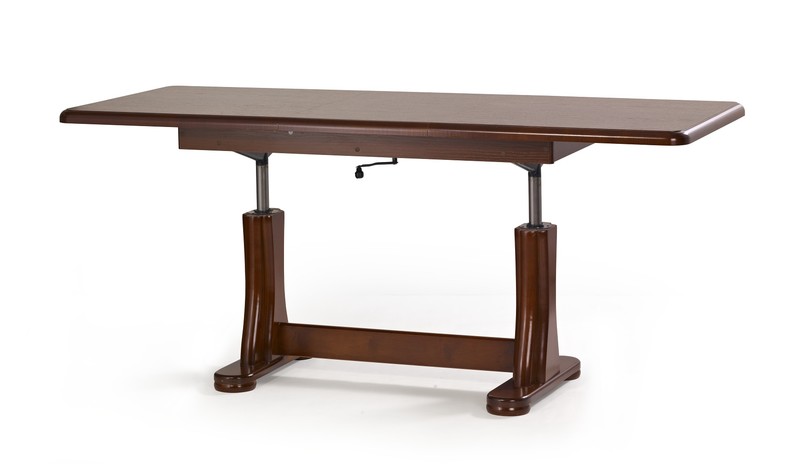 Rozkladací konferenčný stolík TYMON zaujme svojim tradičným dizajnom a elegantným štýlom. Možno ho rozložiť na šírku 164 cm a zložiť na šírku 125 cm. Konštrukcia je vyrobená z masívneho bukového dreva a horná doska z pevnej laminovanej MDF vo farebnom prevedení gaštan. V konštrukcii je zabudovaný zdvíhací mechanizmus, ktorým možno nastaviť výšku stolíka v rozmedzí 65-72 cm. Hĺbka stolíka je 65 cm. Konferenčný stolík Tymon je vhodné umiestniť do obývacích izieb, spální, hotelov a pod. Ak vám nevyhovuje farba, na výber je aj v iných farebných vyhotoveniach.