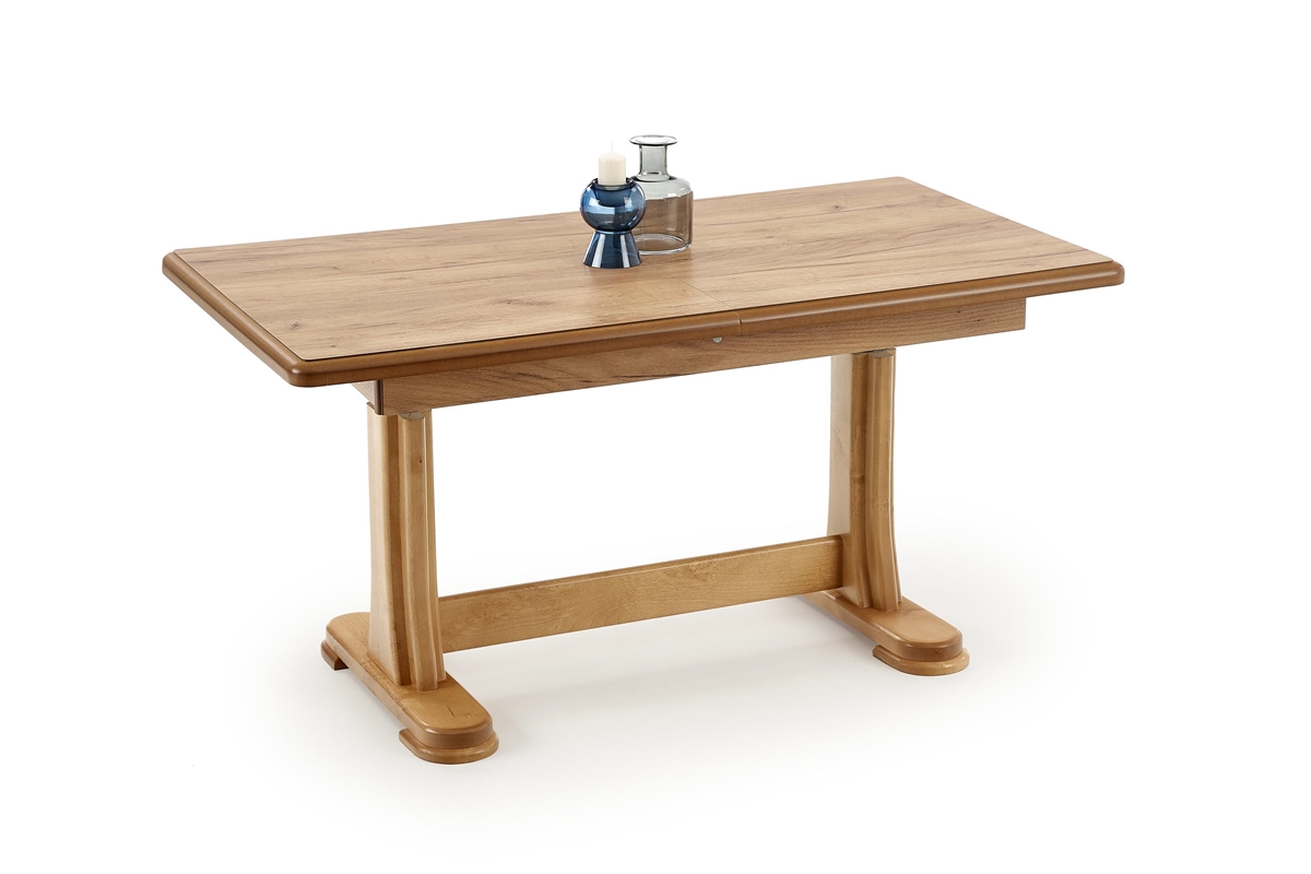 Rozkladací konferenčný stolík TYMON zaujme svojim tradičným dizajnom a elegantným štýlom. Možno ho rozložiť na šírku 164 cm a zložiť na šírku 125 cm. Konštrukcia je vyrobená z masívneho bukového dreva a horná doska z pevnej laminovanej MDF vo farebnom prevedení dub craft. V konštrukcii je zabudovaný zdvíhací mechanizmus, ktorým možno nastaviť výšku stolíka v rozmedzí 65-72 cm. Hĺbka stolíka je 65 cm. Konferenčný stolík Tymon je vhodné umiestniť do obývacích izieb, spální, hotelov a pod. Ak vám nevyhovuje farba, na výber je aj v iných farebných vyhotoveniach.