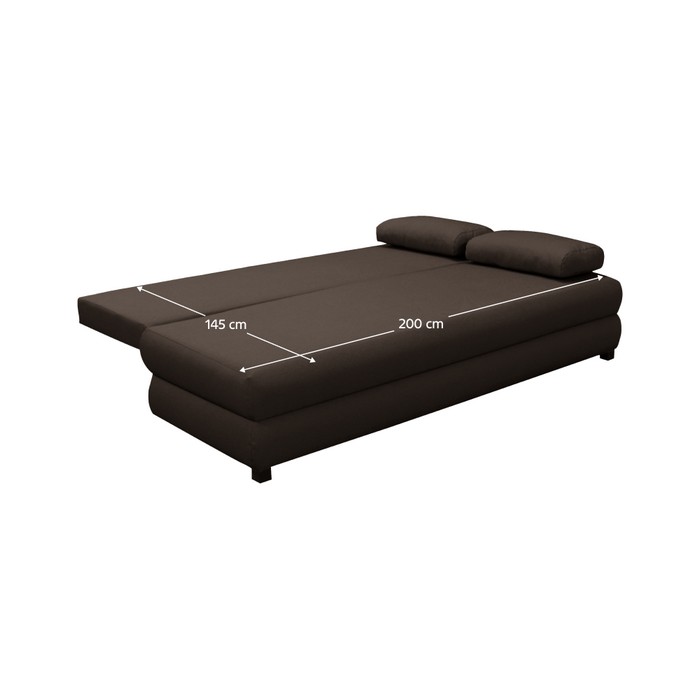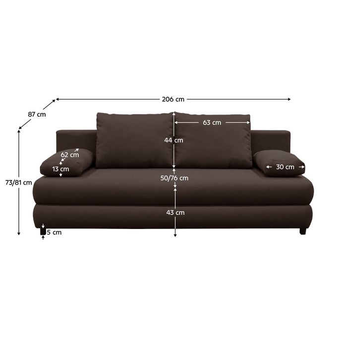 Rozkladacia pohovka BLUM je praktickým a štýlovým riešením do klasických aj moderných interiérov. Je celočalúnená kvalitnou látkou Malmo 26 v hnedej farbe, ktorá sa vyznačuje oderuodolnosťou až 30 000 cyklov podľa testu Martindale. Vďaka kompaktným rozmerom (ŠxHxV): 206x87x73/81 cm je ideálna najmä do menších priestorov, kde ponúka maximálnu funkčnosť bez zbytočného kompromisu v pohodlí. Je rozkladacia a jednoduchým mechanizmom ju premeníte na lôžko s veľkorysou spacou plochou 145x200 cm. Súčasťou je aj praktický úložný priestor, ktorý pomáha udržiavať poriadok v domácnosti. O komfort pri sedení sa stará výplň z PUR peny, pričom výška sedu je 43 cm a hĺbka sedu 50 až 76 cm. Opierka chrbta má výšku 32 cm a nechýbajú ani pohodlné opierky na ruky s rozmermi (ŠxHxV): 62x30x13 cm. Pohovka stojí na čiernych plastových nožičkách, ktoré zabezpečujú stabilitu a vytvárajú 5 cm vysoký priestor od podlahy. Pohovka je dodávaná spolu s vankúšmi s rozmermi 63x44 cm a jej nosnosť je 90 kg na osobu. Celkový dizajn pôsobí moderne a prakticky, pričom pohovka je dodávaná v demonte pre jednoduchšiu manipuláciu.