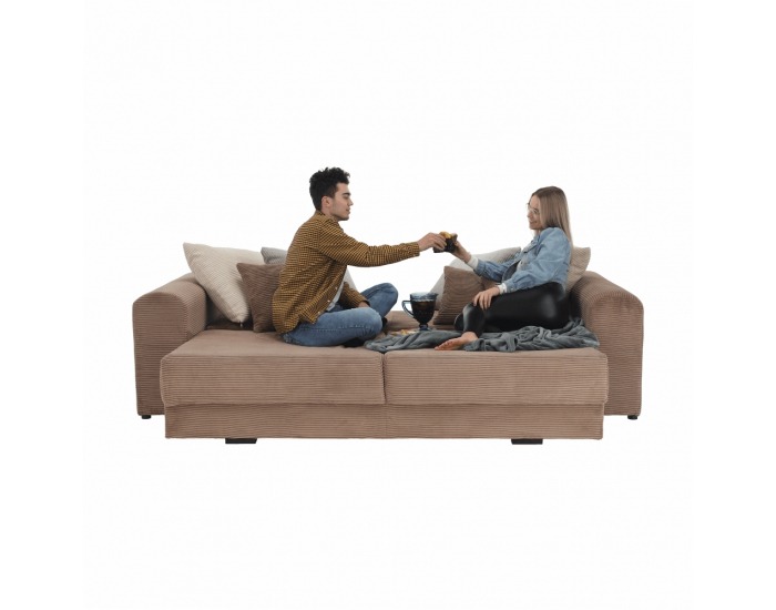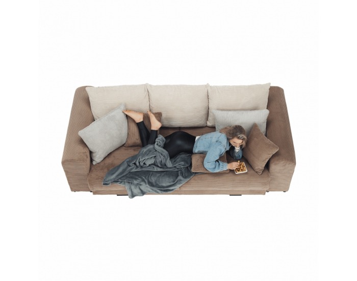 S rozmermi 253 cm na šírku, 121 cm na hĺbku a výškou 80 cm poskytuje dostatok priestoru na pohodlné sedenie aj ležanie. Rozkladacia funkcia umožňuje jednoduchú premenu na lôžko s plochou 165 x 200 cm, čo je ideálne pre návštevy alebo relaxáciu po náročnom dni. Úložný priestor pod sedadlom je skvelým miestom na uskladnenie posteľnej bielizne či sezónnych vecí.