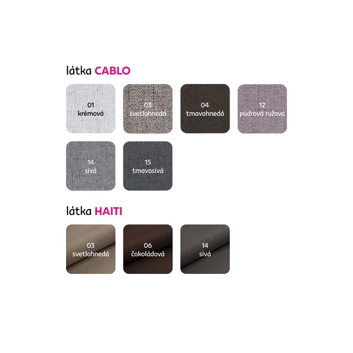 Možnosť objednania v 3 farebných prevedeniach látka Haiti alebo v 6 prevedeniach látky Cablo v cene 389 Eur. Pri individuálnej objednávke je potrebné zaplatiť 20% zálohu z danej sumy. Po uhradení zálohy bude Vaša požiadavka zadaná do výroby. Doba dodania 6-8 týždňov.