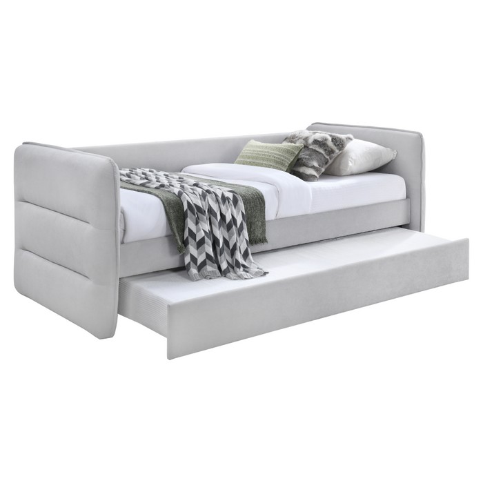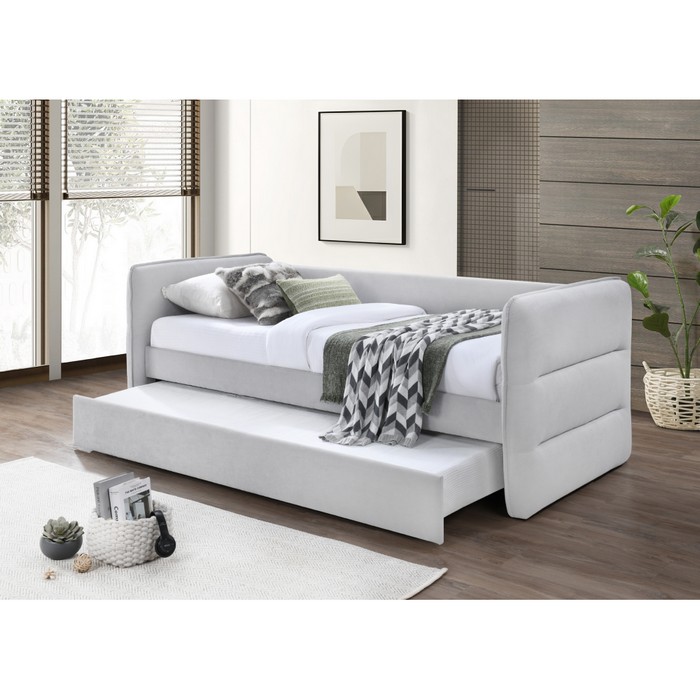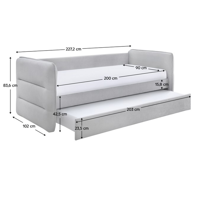 Ak potrebujete vyriešiť spanie v menšom priestore a nechcete ustúpiť z pohodlia, rozkladacia posteľ TRINIA je presne tým typom nábytku, ktorý vás nesklame. Na prvý pohľad vyzerá ako moderné, elegantné jednolôžko, no vďaka šikovnému výsuvnému systému s prístelkou na kolieskach ju behom chvíle premeníte na plnohodnotné dvojlôžko. Jej univerzálne sivé čalúnenie s odolnosťou 32 000 cyklov Martindale zaručí, že sa bez problémov zaradí do akéhokoľvek interiéru a zároveň si zachová svieži vzhľad. Pevná konštrukcia z MDF, drevotriesky a lamina sa postará o stabilitu aj dlhú životnosť. Posteľ má rozmery (ŠxHxV): 102x227,2x83,6 cm, pričom hlavná plocha na spanie ponúka komfortných 90x200 cm. Výška po rošt dosahuje 37,5 cm a matrac sa zapúšťa o 5 cm, čo zvyšuje pohodlie pri používaní. Celá posteľ stojí na čiernych plastových nožičkách vysokých 1,2 cm, ktoré uľahčujú upratovanie pod lôžkom. Súčasťou balenia je latový rošt so vzdialenosťou lát 4,2 cm, ktorý poskytuje správnu podporu a odvetranie matraca. Posteľ sa dodáva bez matracov - odporúčame dokúpiť matrac s rozmerom 90x200 cm a výškou 20 cm, pričom pre prístelku je ideálna výška matraca 15 cm. Nosnosť jedného lôžka je 150 kg, takže Trinia je vhodná aj na každodenné spanie a poskytne dostatok priestoru dvom osobám. Vďaka dekoratívnemu prešitiu, kvalitnému čalúneniu a praktickému rozkladaciemu riešeniu predstavuje posteľ TRINIA elegantný a funkčný prvok do každej domácnosti, kde je priestor vzácny. Dodáva sa v demonte.