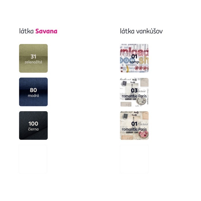 Možnosť objednania v 3 farebných prevedeniach látky Savana v kombinácií so vzorkovanou látkou v cene 359 Eur. Pri individuálnej objednávke je potrebné zaplatiť 10% zálohu z danej sumy. Po uhradení zálohy bude Vaša požiadavka zadaná do výroby. Dodacia lehota 6-8 týždňov.