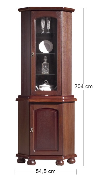Oblé tvary s jednoduchými líniami sú charakteristické pre rohovú vitrínu ANITA. Vo farebnom prevedení Bawaria+ pôsobí elegantne, ladne a vkusne. Drevo využívané na výrobu nábytku je pevný a vysoko kvalitný dub. Ak si želáte iné farebné prevedenie, na požiadanie si ho môžete vybrať podľa vlastnej vôle. Rozmery vitríny sú (ŠxHxV): 54,5x54,5x204 cm. Nakombinujte si nábytok podľa seba a vneste do svojho domova harmóniu a čarovnú atmosféru s pôvabnou kolekciou Anita.