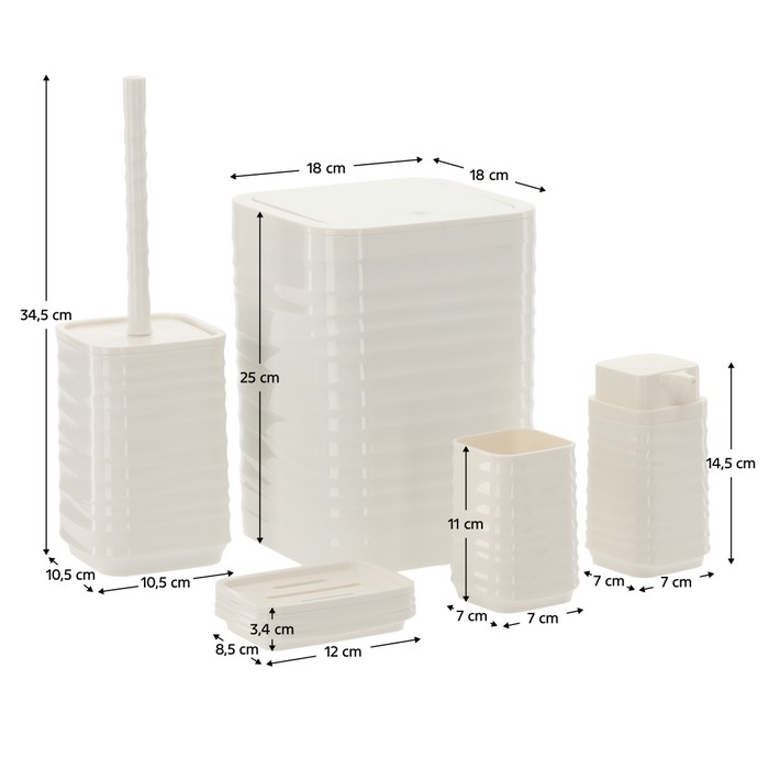 Vneste do svojej kúpeľne sviežosť a eleganciu s 5-dielnou kúpeľňovou sadou MATIO, ktorá spoľahlivo zjednotí priestor bez potreby veľkých úprav. Sada je vyrobená z odolného plastu v čistobielej farbe a ponúka všetko potrebné pre dokonalú organizáciu a každodenný komfort. Obsahuje odpadkový kôš (ŠxV): 18x25 cm, WC kefu (ŠxV): 10,5x34,5 cm, dávkovač mydla (ŠxV): 7x14,5 cm), pohár na zubné kefky (ŠxV): 7x11 cm a misku na mydlo (ŠxHxV): 12x8,5x3,4 cm. Vďaka svojmu praktickému spracovaniu a jednoduchému, elegantnému dizajnu vám sada pomôže udržiavať poriadok a zároveň dodá kúpeľni harmonický a moderný vzhľad. Ideálna voľba pre tých, ktorí chcú spojiť funkčnosť so štýlom.