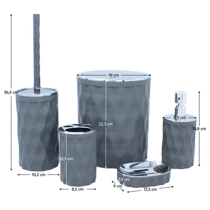 Doprajte svojej kúpeľni svieži a upravený vzhľad s praktickou 5-dielnou súpravou RABER. Táto elegantná sada zo sivého plastu spája funkčnosť s moderným dizajnom a ponúka všetko, čo potrebujete pre dokonalú organizáciu priestoru. Nájdete v nej odpadkový kôš (ŠxV): 19x22,3 cm, WC kefu (ŠxV): 10,2x36,5 cm, dávkovač mydla (ŠxV): 8,5x18,8 cm, pohár na zubné kefky (ŠxV): 8,5x12,5 cm a misku na mydlo (ŠxHxV): 12,5x9x2,9 cm. Vďaka tejto sade si udržíte poriadok, zjednotíte štýl svojej kúpeľne a vytvoríte príjemné miesto pre každodennú starostlivosť. Jednoduchý a elegantný dizajn doplní akýkoľvek interiér a dodá mu čistý, harmonický nádych.