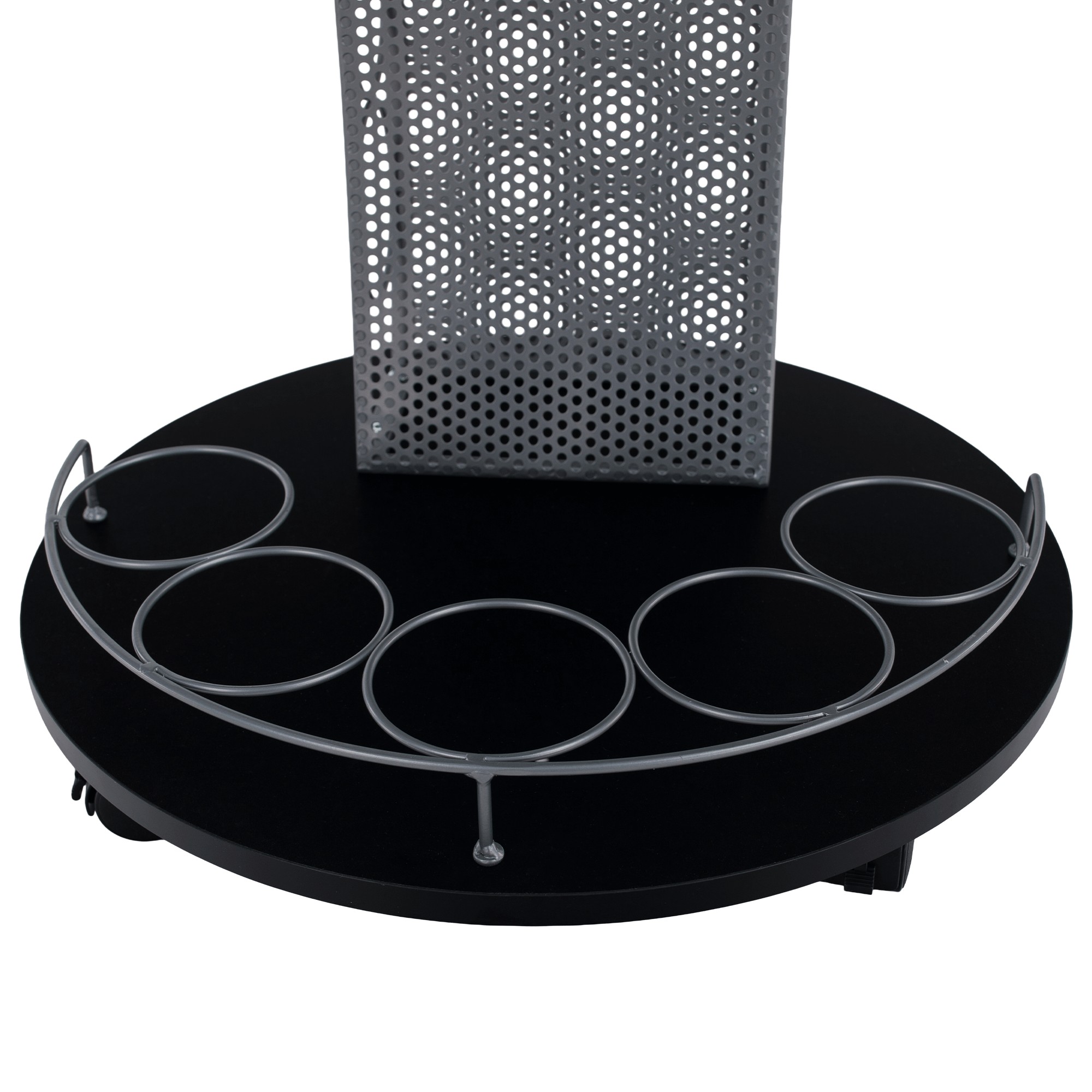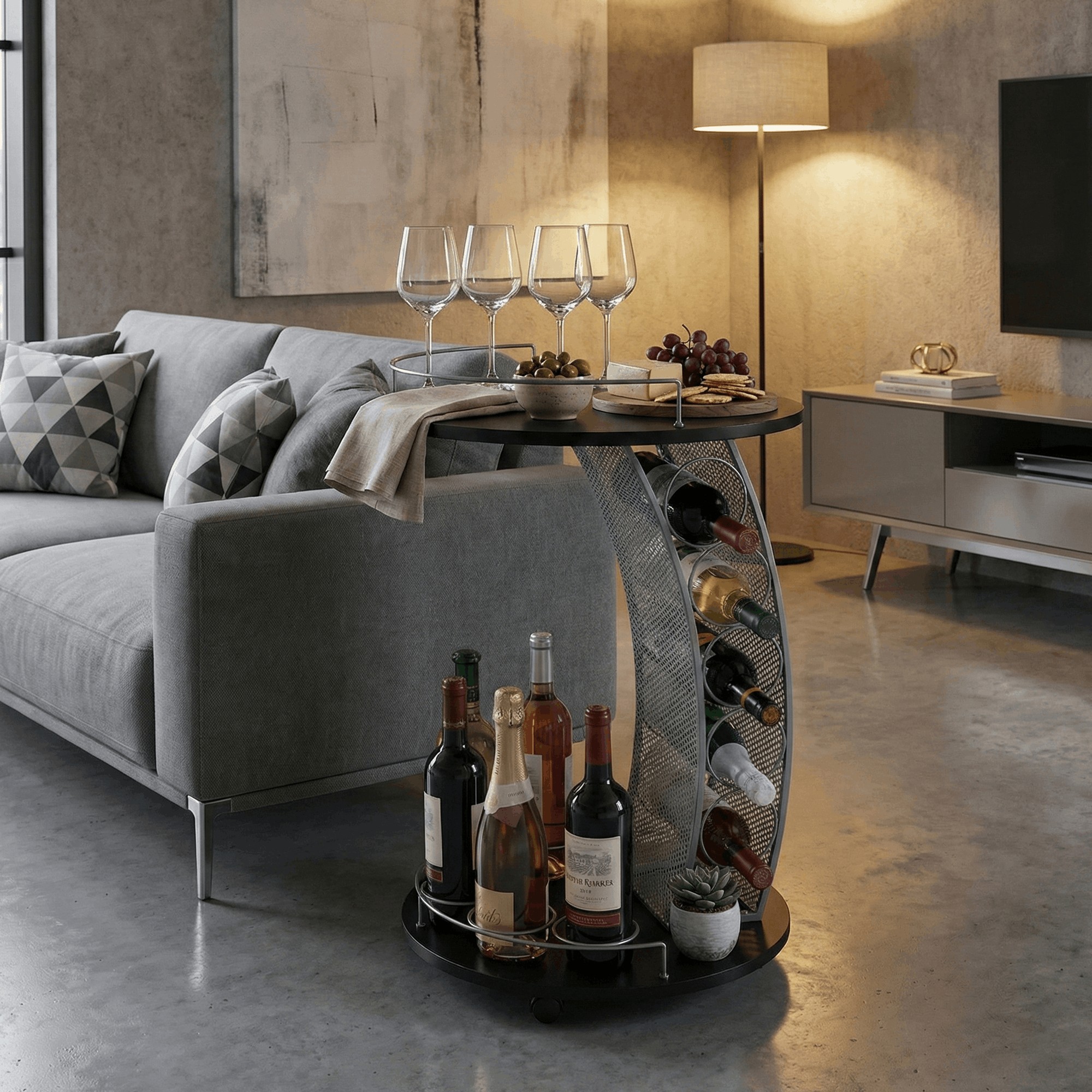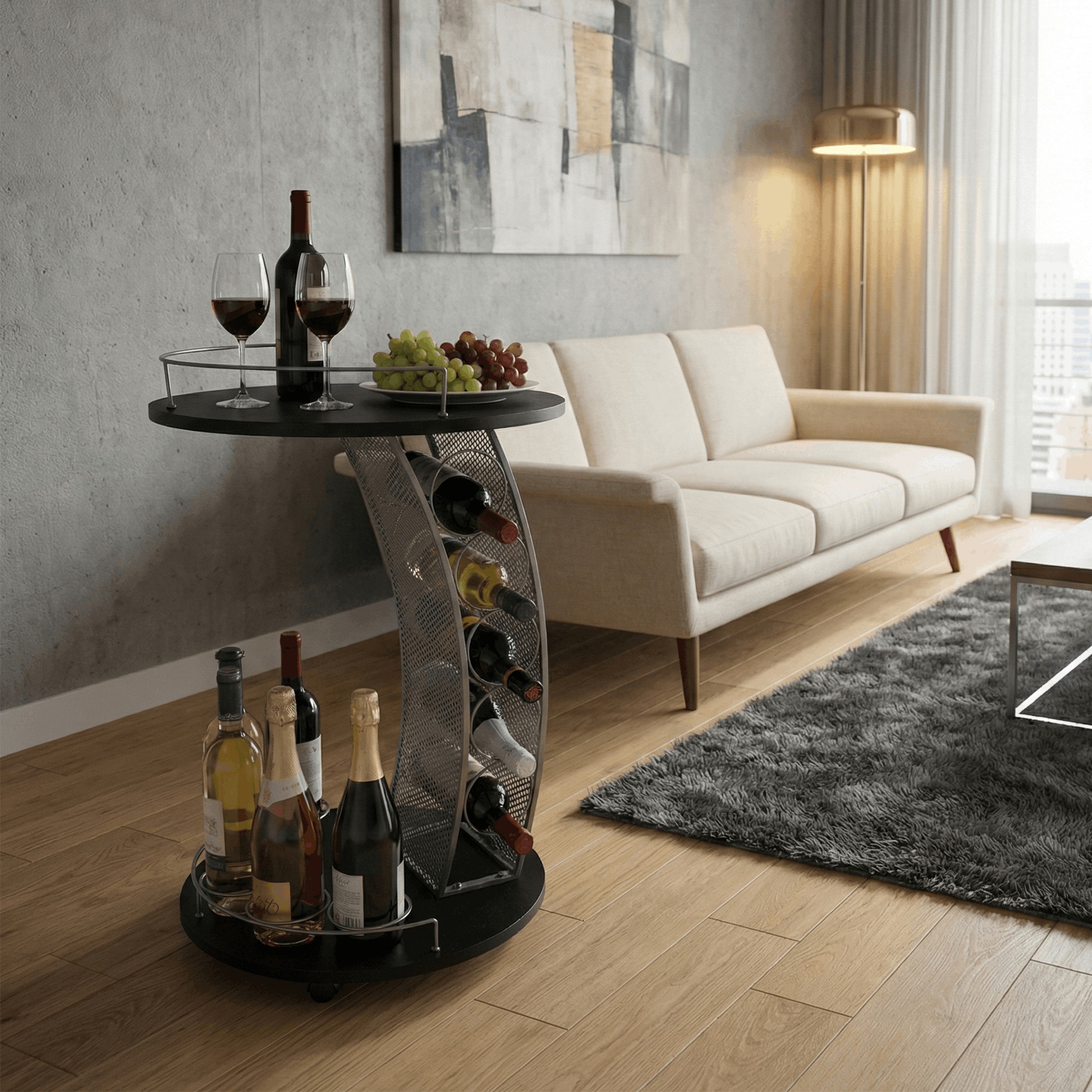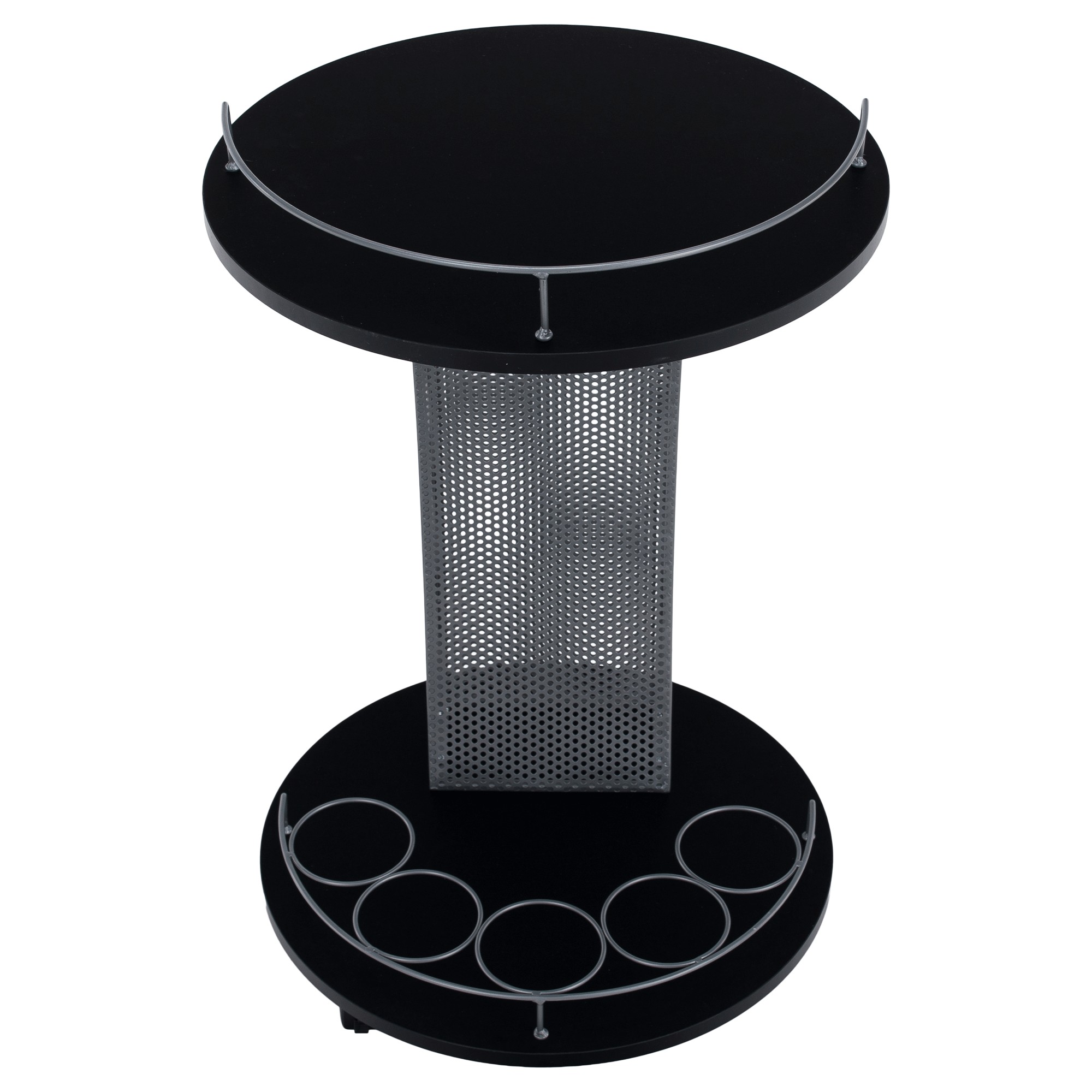 Servírovací stolík ALADAR NEW je praktický pomocník do každej domácnosti, ktorý vám výrazne uľahčí servírovanie. Vďaka svojmu modernému a originálnemu vzhľadu zaujme nielen vás, ale aj každú návštevu. Napriek kompaktným rozmerom ponúka dostatok úložného priestoru - disponuje poschodovou policou na fľaše s kapacitou až päť kusov, spodnou plochou vhodnou na ďalšie fľaše či poháre a vrchnou časťou ideálnou napríklad na ovocie alebo drobné občerstvenie. Manipulácia so stolíkom je veľmi jednoduchá vďaka praktickým kolieskam, ktoré umožňujú jeho ľahké presúvanie. Je vyrobený z kombinácie laminovanej DTD dosky a kovu, čo zaručuje jeho pevnosť a stabilitu. Farebné prevedenie v čiernej a striebornej pôsobí elegantne a ľahko sa hodí do rôznych interiérov. Stolík má rozmery (ŠxHxV): 47x47x74 cm, hrúbka materiálu je 15 mm a dodáva sa v demontovanom stave.