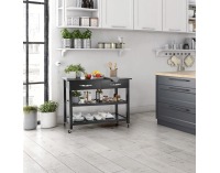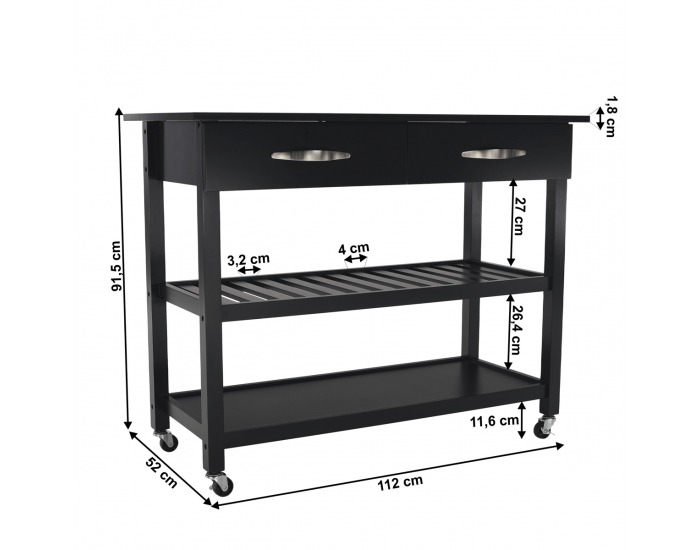 Stolík má rozmery 112 cm (šírka), 91.5 cm (výška) a 52 cm (hĺbka). Jeho tmavá čierna farba dodáva priestoru sofistikovanosť a eleganciu. Stolík je ideálny pre celoročné použitie v interiéri, či už v obývacej izbe alebo kuchyni.