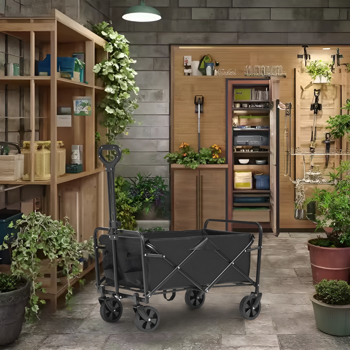 Skladací vozík KARIL je praktickým pomocníkom na záhradu, kempovanie, výlety aj rôzne outdoorové aktivity. Vďaka veľkorysému objemu 60 litrov a nosnosti až 100 kg bez problémov odvezie nielen nákupy, hračky či drobnosti, ale aj batohy a väčšie vybavenie. Konštrukcia je vyrobená z pevnej ocele v čiernej farbe, ktorú dopĺňa odolná látka Oxford, známa svojou vysokou pevnosťou, odolnosťou voči natiahnutiu a roztrhnutiu, pričom oderuodolnosť dosahuje 7 600 cyklov podľa testu Martindale. Jeho rozmery sú (ŠxHxV): 45x73,5x64/87 cm, pričom výšku je možné prispôsobiť vďaka výškovo nastaviteľnej rukoväti. Po zložení zaberá minimum miesta a jeho rozmery sú len (ŠxHxV): 45x12,5x64 cm, čo výrazne uľahčuje skladovanie aj prepravu. Stabilitu a jednoduchú manipuláciu zabezpečujú štyri kolieska s priemerom 12 cm, z ktorých dve sú pevné a dve otočné, vďaka čomu sa vozík ľahko ovláda aj na nerovnom teréne. Súčasťou je aj odnímateľný látkový košík doplnený o dve praktické bočné vrecká na drobnosti, ktoré chcete mať vždy po ruke. Napriek svojej robustnosti váži vozík iba 5 kg, je dodávaný v zmontovanom stave a jeho skladacia konštrukcia zaručuje jednoduchú manipuláciu aj rýchle použitie. Vozík sa tak stáva funkčnou a nepostrádateľnou súčasťou výbavy každého, kto si užíva aktívne trávenie voľného času.