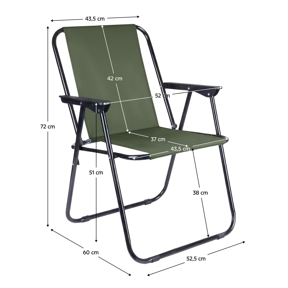 Praktická kempingová stolička RISTON je ideálnym spoločníkom na výlety, kempovanie, rybačku či festivaly. Vďaka ľahkej, skladacej oceľovej konštrukcii v čiernej farbe ju jednoducho prenesiete a uskladníte. Pevný oceľový rám zabezpečuje stabilitu, zatiaľ čo odolná látka Oxford v zelenej farbe garantuje komfort aj pri dlhšom sedení a zároveň je odolná voči opotrebeniu. Stolička je vybavená plastovými opierkami, ktoré poskytujú oporu unaveným rukám. Vďaka skladacej funkcii ju môžete jednoducho zložiť a rozložiť podľa potreby. S kempingovou stoličkou Riston si užijete pohodlný oddych kdekoľvek. Celkové rozmery stoličky sú (ŠxHxV): 52,5×60×72 cm, rozmery sedenia sú (ŠxHxV): 43,5×37×42 cm, výška operadla je 42 cm a jeho šírka 43,5 cm. Maximálne zaťaženie stoličky je 70 kg. Dodávaná je v monte.