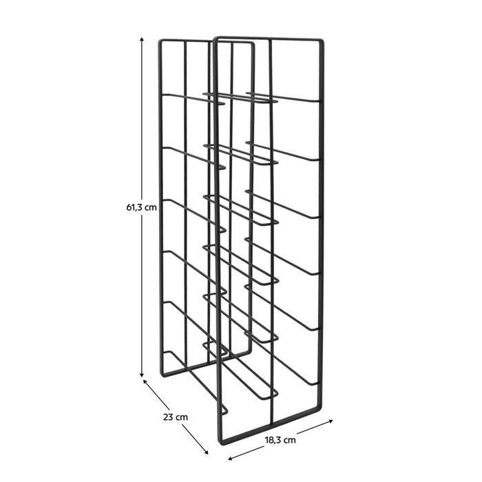 Stojan na víno GAMEZ predstavuje praktický a štýlový spôsob, ako mať svoje obľúbené vína vždy prehľadne uložené. Vyrobený je z odolnej uhlíkovej ocele v čiernom prevedení, vďaka čomu pôsobí moderne a ľahko sa začlení do rôznych typov interiérov - od minimalistických až po industriálne ladené priestory. Vďaka svojim kompaktným rozmerom (ŠxHxV): 18,3x23x61,3 cm šetrí miesto a zároveň ponúka kapacitu až 12 fliaš vína. Stabilnú konštrukciu s nosnosťou 15 kg dopĺňa zadná ochranná mriežka, ktorá zabraňuje nechcenému vypadnutiu fliaš a zvyšuje bezpečnosť uskladnenia. Minimalistický dizajn podčiarkuje jeho elegantný vzhľad bez zbytočných rušivých prvkov. Stojan sa dodáva v monte, pripravený na okamžité použitie.Je ideálnou voľbou pre každého milovníka vína, ktorý hľadá funkčné, priestorovo úsporné a estetické riešenie pre uskladnenie svojich fliaš.