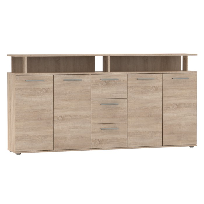 Komoda ALBI v elegantnom prevedení dub sonoma je ideálnym riešením pre tých, ktorí chcú mať vo svojom interiéri štýl aj dokonalý poriadok. Vďaka čistým líniám a nadčasovému dizajnu ľahko zapadne do moderného aj klasického zariadenia. Vyrobená je z laminovanej DTD s hrúbkou 1,6 cm, čo zabezpečuje pevnú a stabilnú konštrukciu pri každodennom používaní. Pri rozmeroch (ŠxHxV): 190x32,5xx95,6 cm ponúka štedrý úložný priestor v podobe štyroch dvierok, troch zásuviek, vnútorných políc aj otvoreného úložného priestoru. Vrchná doska má nosnosť 15 kg, pričom každá polica a zásuvka unesie 5 kg. Komoda disponuje plastovými úchytkami v sivej farbe a plastovými klzákmi s výškou 1,6 cm, ktoré chránia podlahu pred poškodením. Pre vyššiu bezpečnosť odporúčame pripevnenie k stene. Ide o kvalitný slovenský výrobok dodávaný v demonte.