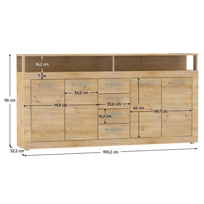 Predstavujeme vám elegantnú a funkčnú komodu LUNYSA 2 NEW, ktorá vám uľahčí udržiavanie poriadku a prehľadné uskladnenie vašich vecí. V modernom farebnom prevedení dub artisan sa vkusne hodí nielen do súčasného, ale aj klasického interiéru. Komoda ponúka praktický úložný priestor v podobe štyroch dvierok a štyroch zásuviek, ktoré poskytujú dostatok miesta na uloženie oblečenia, dokumentov či iných osobných vecí. Nadstavba s vyvýšenou policou je ideálna na vystavenie dekorácií alebo obľúbených doplnkov. Rozmery komody sú (ŠxHxV): 190x32,2x96 cm, pričom rozmery odkladacieho priestoru sú (ŠxHxV): 190x30,4x16 cm. Komoda je vyrobená z kvalitnej laminovanej DTD s hrúbkou 1,6 cm, čo zaručuje pevnú a stabilnú konštrukciu. Dvierka a zásuvky sú vybavené sivými plastovými úchytkami so šírkou 18 cm, ktoré podčiarkujú jej moderný vzhľad. Komoda je zároveň praktická z hľadiska nosnosti - vrchná polica unesie až 15 kg, vnútorné police 5 kg a zásuvky 3 kg. Ak hľadáte štýlový a praktický kus nábytku, ktorý ponúka množstvo úložného priestoru a zároveň zapadne do rôznych štýlov zariadenia, komoda Lunysa 2 New bude skvelou voľbou pre váš domov.