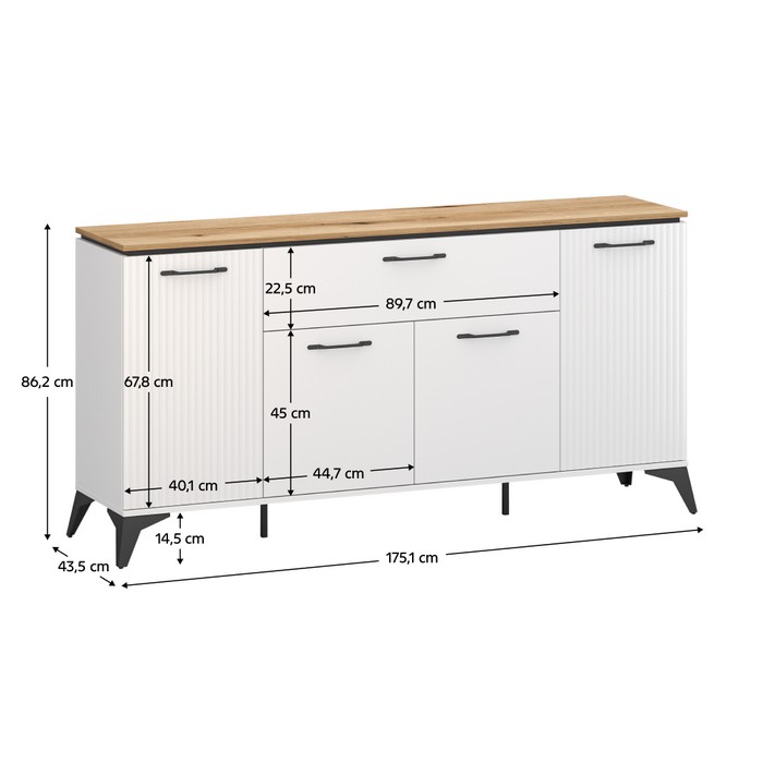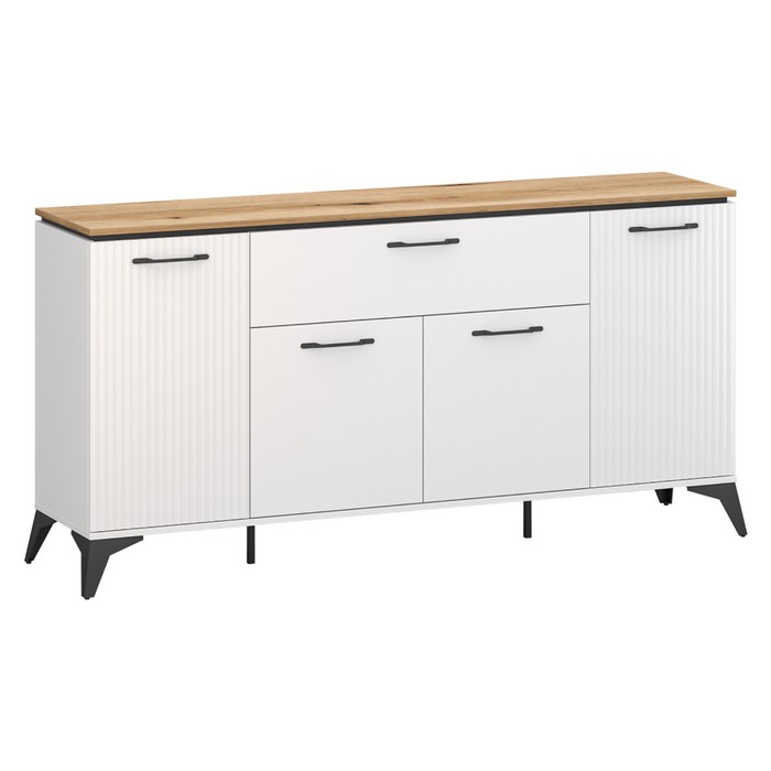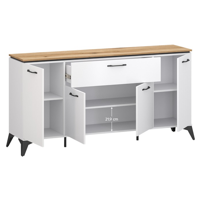 Štvordverová komoda VELIS 4D1S ponúka veľkorysý a prakticky riešený úložný priestor, ktorý pozostáva z viacerých políc a jednej zásuvky. Vďaka tomuto usporiadaniu je ideálna na prehľadné uloženie oblečenia, dokumentov či domácich doplnkov. Vrchná doska komody zároveň poskytuje dostatok miesta na dekorácie, vázy alebo fotografie, ktoré oživia váš interiér. Komoda je vyrobená z kvalitnej laminovanej DTD v kombinácii s fóliovanou MDF a PVC, v elegantnom farebnom prevedení biela s dekorom dub evoke. Jej rozmery sú (ŠxHxV): 175,1x43,5x86,2 cm a hrúbka použitého materiálu je 1,6 cm. Police majú nosnosť do 3 kg, zásuvka unesie 5 kg a vrchná doska až 30 kg. Stabilitu zabezpečujú kovové nožičky v čiernej farbe s výškou 14,5 cm, doplnené o stredovú podpornú nožičku. Moderný vzhľad podčiarkujú kovové čierne úchytky a dekoratívne ryhované dvierka. Pre zvýšenie bezpečnosti odporúčame komodu pripevniť k stene. Produkt je dostupný len na objednávku, dodáva sa v demontovanom stave a dodacia lehota je približne 3 až 5 týždňov.
