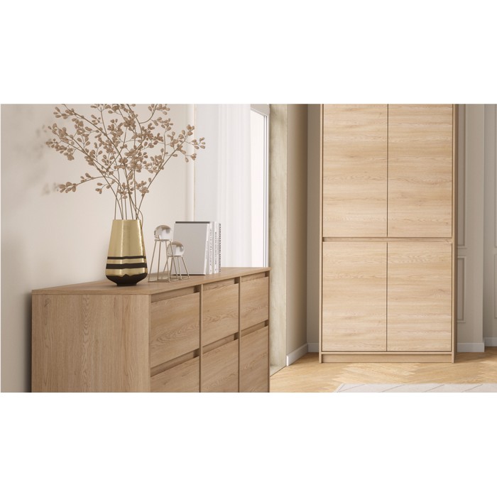 Elegantná skriňa MANOL S4D v sebe spája moderný vzhľad, praktické riešenia a vysokú kvalitu spracovania, vďaka čomu sa dokonale hodí do spálne, detskej alebo študentskej izby. Vyrobená je z laminovanej drevotrieskovej dosky (DTD) s hrúbkou 1,5 cm, doplnenej o odolné ABS hrany a zadnú časť z HDF sololitu, čo zabezpečuje pevnosť, stabilitu a dlhú životnosť. V odtieni cremona pôsobí skriňa teplo, elegantne a nadčasovo, pričom sa ľahko kombinuje s iným nábytkom. Bezúchytkové čelá so skrytým zrezaním podčiarkujú jej čisté línie a minimalistický dizajn, ktorý perfektne zapadne do moderných interiérov. Skriňa má štvordverové prevedenie a ponúka praktický úložný priestor - jej vnútorné usporiadanie tvorí vešiaková tyč s nosnosťou 7 kg na pohodlné zavesenie odevov a polica s nosnosťou 5 kg na uloženie poskladaných vecí. Vrchná doska unesie až 10 kg, takže na ňu možno umiestniť aj dekorácie či úložné boxy. Skriňa stojí na plastových nožičkách, je vybavená kvalitnými pántmi a pre väčšiu bezpečnosť sa odporúča pripevniť k stene. S rozmermi (ŠxHxV). 90,8x52,1x197,6 cm poskytuje dostatok priestoru pre vaše oblečenie a doplnky. Dodáva sa v demonte, čo uľahčuje prepravu aj montáž.