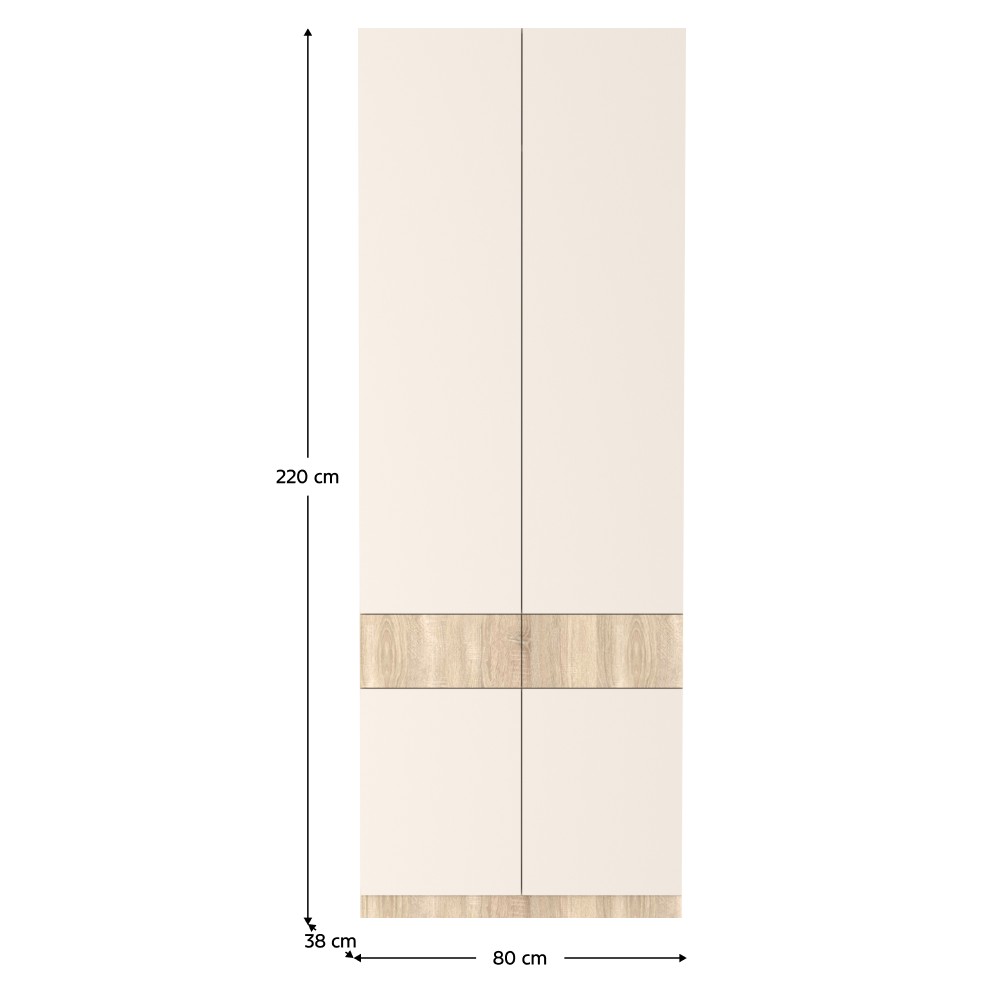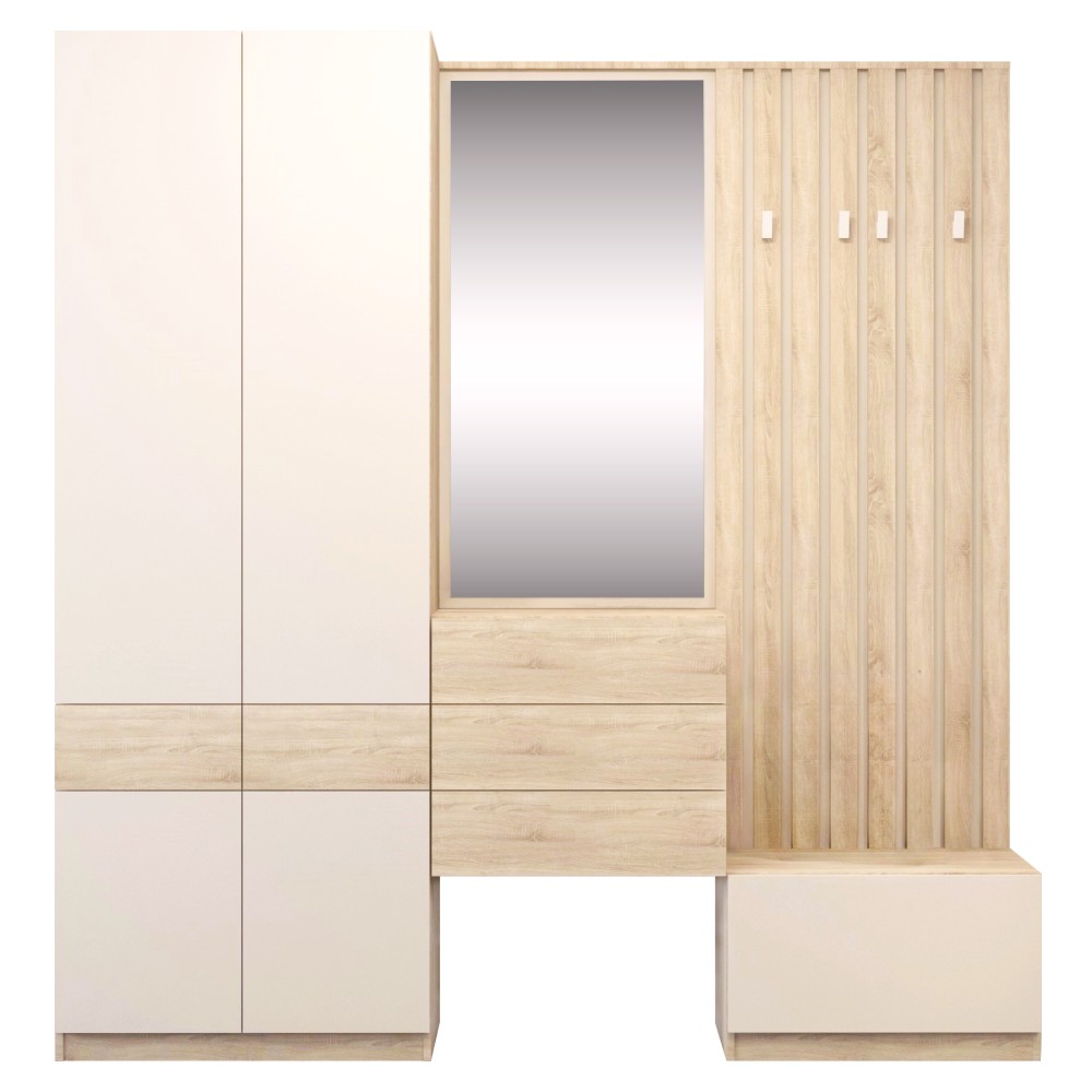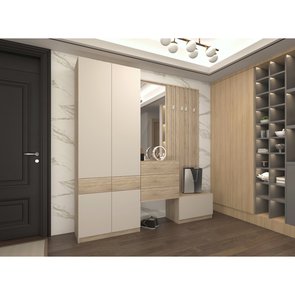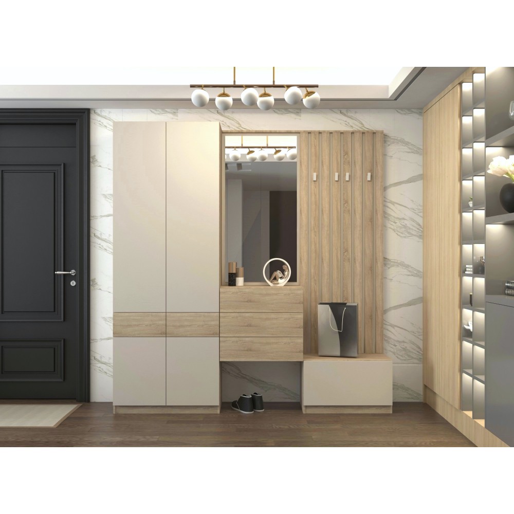Predsieň je priestorom prvého dojmu, preto by mala byť nielen funkčná, ale aj štýlová. Zostava VERTIO v kombinácii dub sonoma a kašmír spája moderný dizajn s praktickými riešeniami. Vyrobená je z laminovanej DTD s hrúbkou 1,6 - 2,2 cm, pričom všetky úložné časti sú vybavené dotykovým systémom PUSH UP pre pohodlné otváranie bez úchytiek. Komponenty sa objednávajú jednotlivo, vďaka čomu si zostavu môžete vyskladať podľa vlastných potrieb a veľkosti priestoru. Vertio sa hodí do každej predsiene. Štvordverová skriňa VERTIO SZF4D2S ponúka praktický úložný priestor - výsuvnú vešiakovú tyč s nosnosťou 8 kg, police s nosnosťou 7 kg a dva šuplíky s plnovýsuvným gulôčkovým ložiskom, každý s nosnosťou 3 kg. Rozmery skrine sú (ŠxHxV): 80x38x220 cm. Zadná strana a dno zásuviek majú hrúbku 0,3 cm a sú vo farbe dub sonoma. Skriňa má plastové klzáky, kvalitné pánty, hrany z papiera impregnovaného termosetovými polymérmi a čistý vzhľad bez úchytiek. Odporúča sa pripevniť ju k stene. Dodávaná je v demonte.