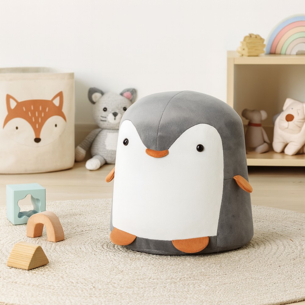 Taburet RAINO v tvare tučniaka prinesie do detskej izby hravosť a rozkošný dizajn, ktorý si deti okamžite obľúbia. So svojimi rozmermi (ŠxHxV): 28x28x34 cm je kompaktný, no zároveň poskytne pohodlné miesto na sedenie či odpočinok. Vyrobený je z pevného dreveného rámu, ktorý zaručuje stabilitu, a potiahnutý látkou v kombinácii sivej a bielej farby, čo mu dodáva svieži a priateľský vzhľad. Mäkká penová výplň sa postará o komfort, zatiaľ čo vysoká oderuodolnosť textílie (85 000 oderov podľa testu Martindale) garantuje dlhú životnosť aj pri každodennom používaní. Taburet unesie až 50 kg, takže je ideálny pre deti pri čítaní, hraní alebo sledovaní rozprávok. Okrem funkčnosti pôsobí aj ako dekoratívny doplnok, ktorý rozžiari priestor a prinesie do izby kamarátsku atmosféru. Taburet Raino je dodávaný v demonte, no jeho zloženie je jednoduché a rýchle. Tento veselý tučniak tak v izbe poslúži nielen ako praktické sedenie, ale aj ako originálny kúsok, ktorý vnesie pokoj a kúsok dobrodružstva.