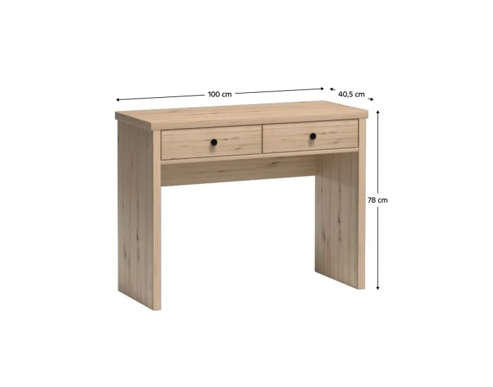 S rozmermi 100 cm na šírku, 78 cm na výšku a 40,5 cm do hĺbky poskytuje dostatok priestoru pre vaše kozmetické potreby. Vyrobený z kvalitného laminovaného DTD materiálu, tento stolík je odolný a ľahko sa udržiava – stačí ho utierať navlhko. Jeho svetlá farba dreva v kombinácii s čiernymi detailmi dodáva miestnosti svieži a moderný vzhľad.