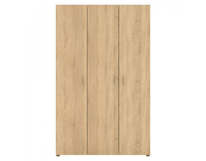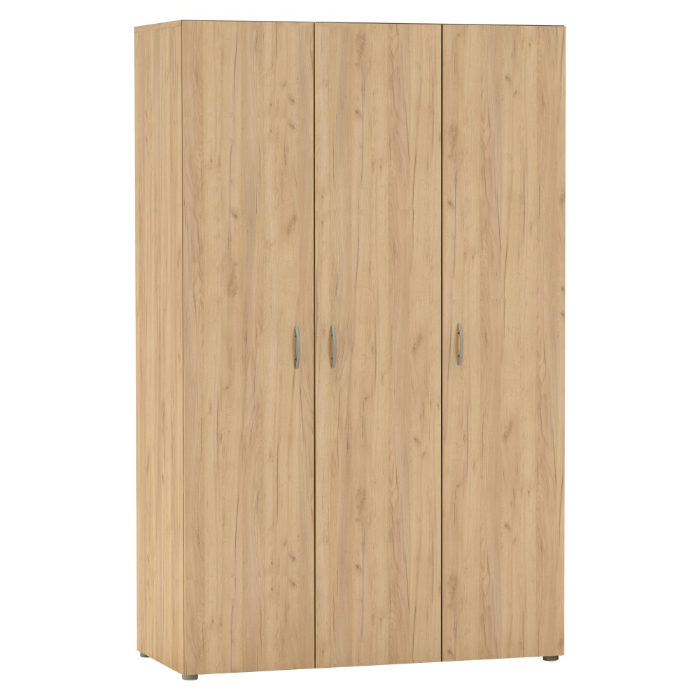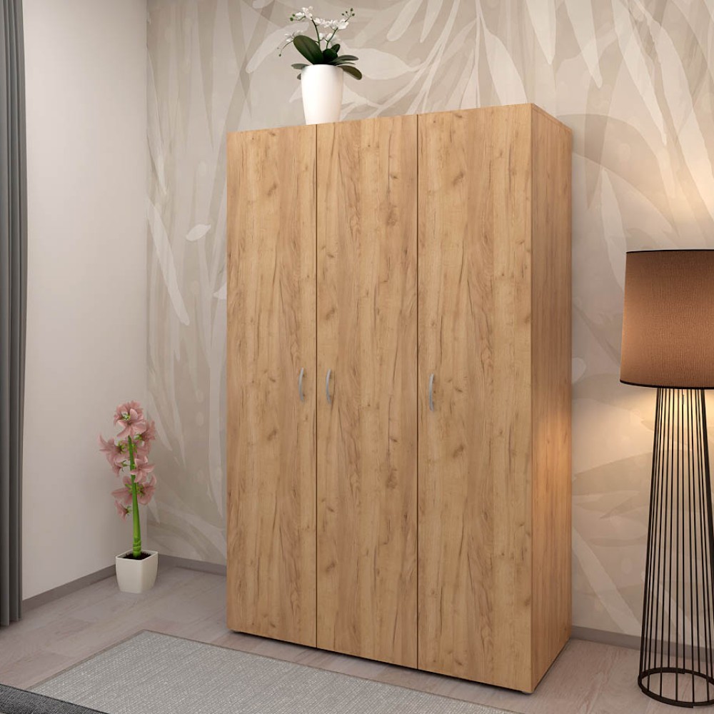 Trojdverová šatníková skriňa Ramsa 3 je praktický a elegantný kus nábytku, ktorý ponúka dostatok úložného priestoru. Vďaka prevedeniu dub craft zlatý sa ľahko hodí do rôznych interiérov. Vyrobená je z aglomerovaného materiálu – laminovanej DTD. Pozostáva z police, ktorá sa nachádza v hornej časti skrine a prakticky poslúži na odkladanie rôznych vecí. V strede skrine sa nachádza vešiaková časť, ktorá sa postará o organizáciu vášho oblečenia. V pravej časti skrine sa nachádza policová časť, ktorá ponúka ešte viac úložného priestoru. Manipuláciu s dverami zabezpečujú úchytky v striebornom prevedení. Stabilita je zabezpečená vďaka plastovým klzákom. Celkové rozmery skrine sú (ŠxHxV): 111×51,6 ×179 cm. Hrúbka materiálu je 1,6 cm, nosnosť police je 5 kg a nosnosť vešiakovej tyče je 12 kg.