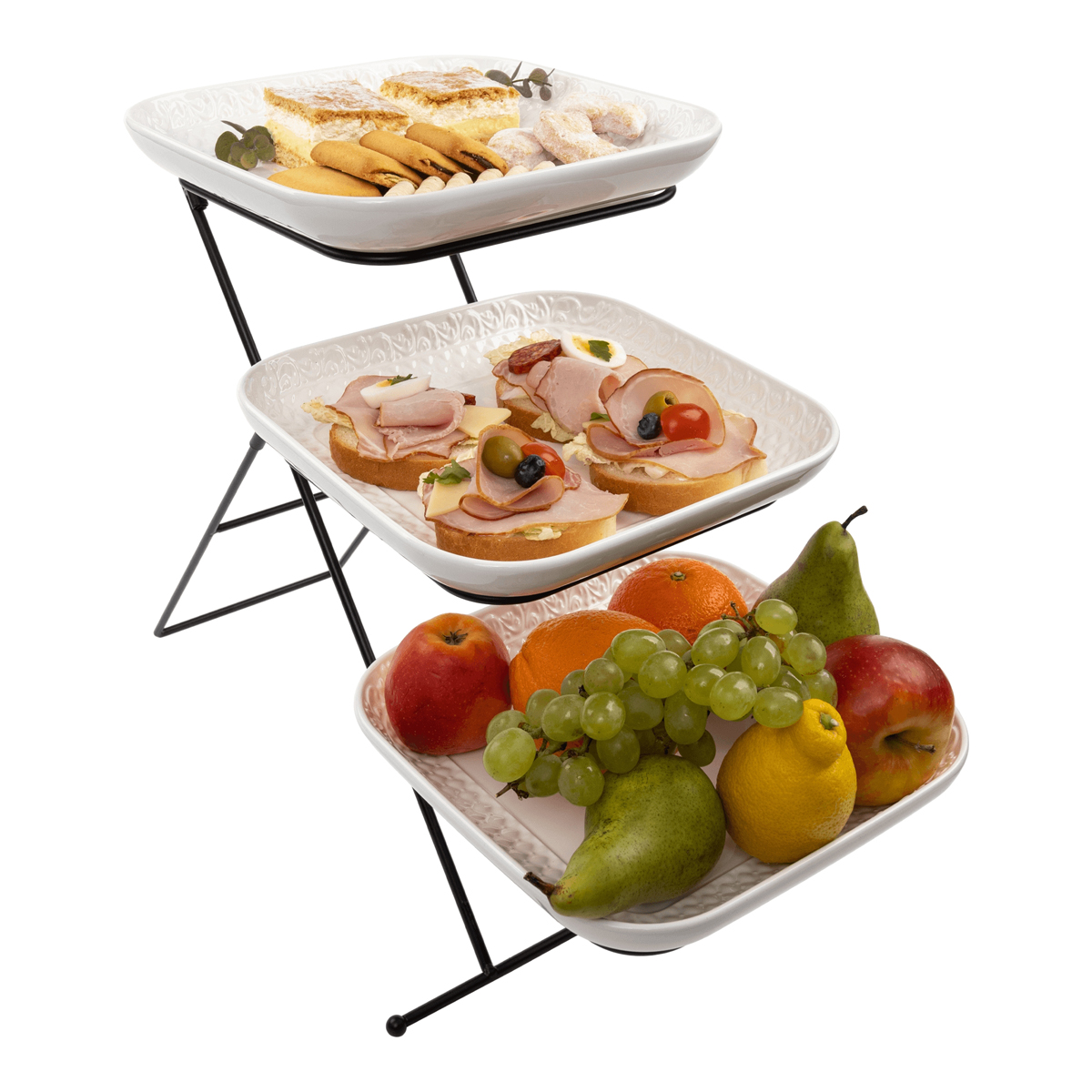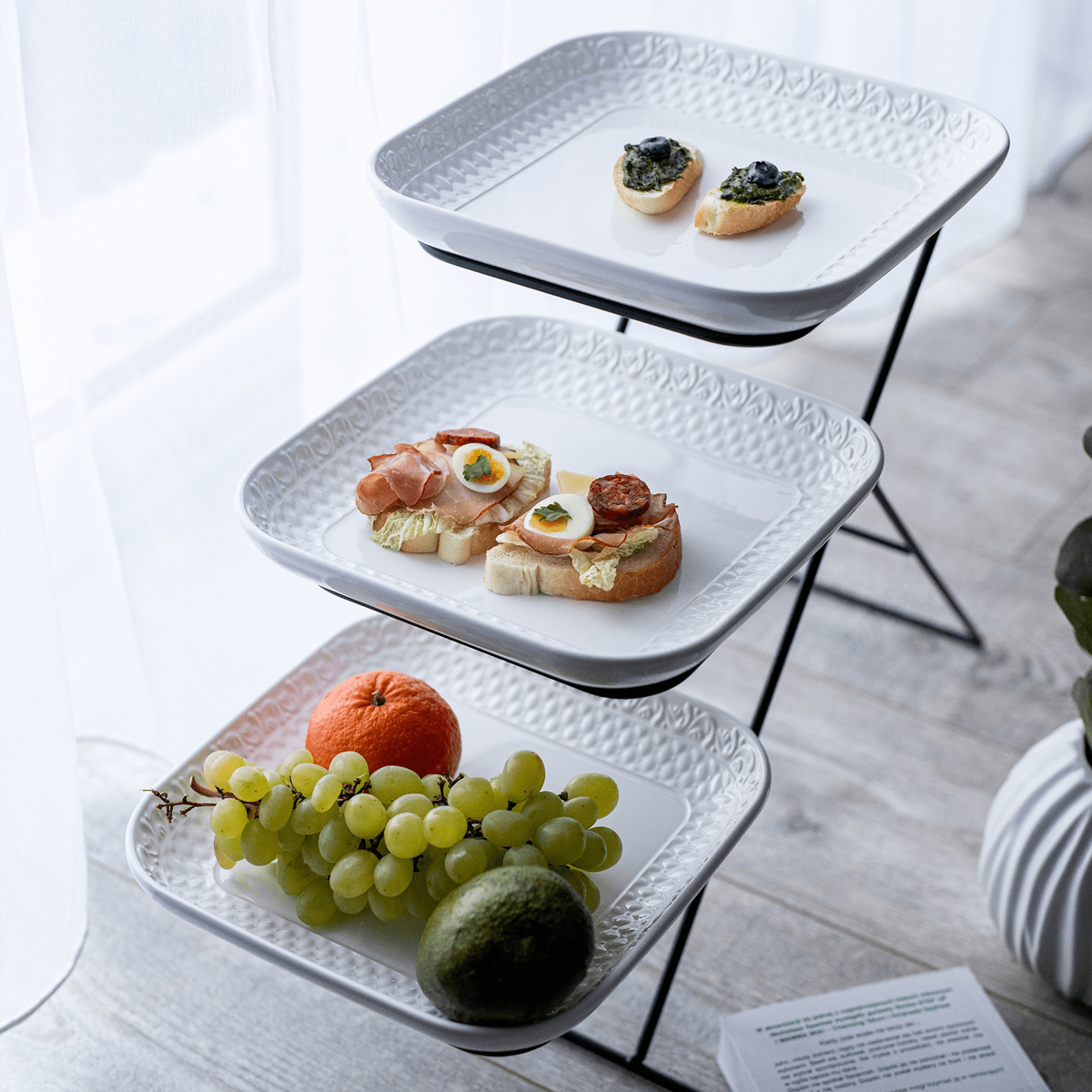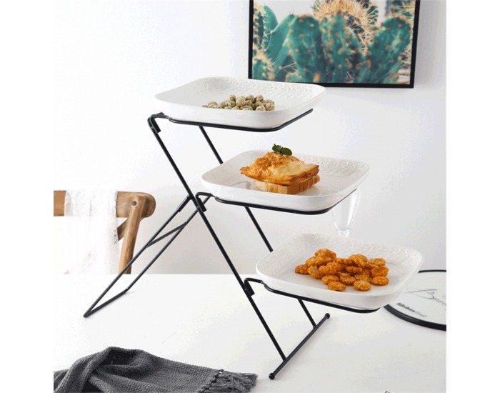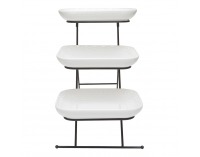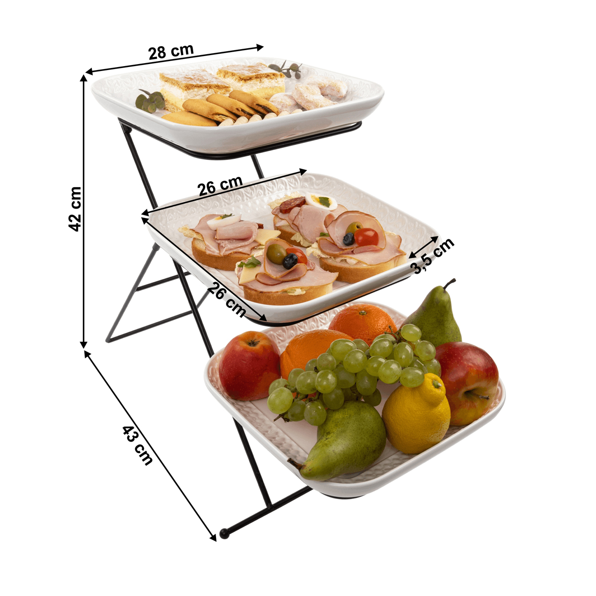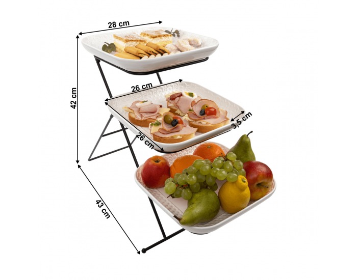 Vyrobený z kvalitnej dolomitovej keramiky a kovu, etažér ponúka nielen estetický vzhľad, ale aj vysokú odolnosť. S rozmermi 42 cm na výšku, 43 cm na šírku a 28 cm na hĺbku poskytuje dostatok priestoru pre vaše obľúbené dezerty, ovocie alebo iné pochutiny. Jeho hranatý tvar dodáva moderný vzhľad, ktorý sa hodí do rôznych typov interiérov.