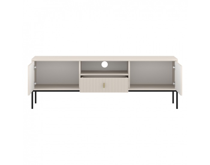 PUSH ON systém na dvierkach umožňuje jednoduché otváranie bez nutnosti použitia úchytiek, čo prispieva k čistému dizajnu. Pre väčšiu bezpečnosť je možné stolík pripevniť o stenu. Vnútorná polička poskytuje priestor na uloženie rôznych predmetov alebo elektroniky.