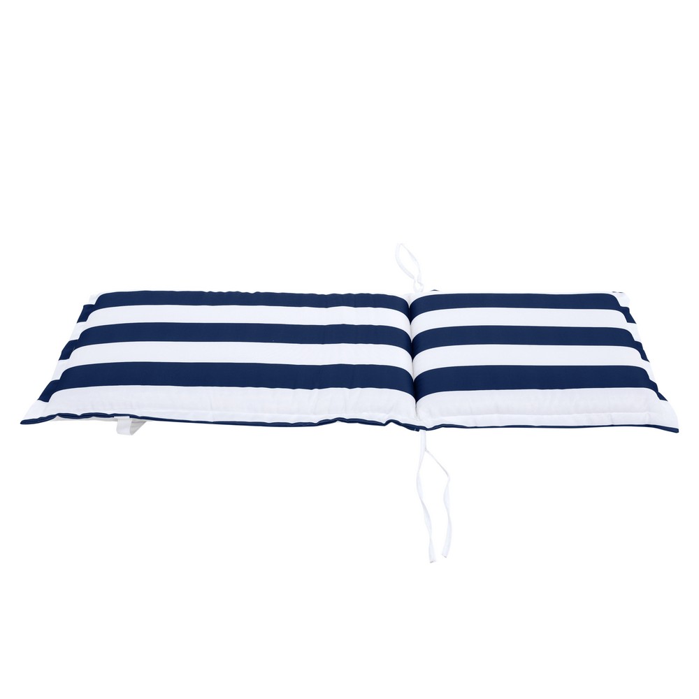 Záhradný vankúš ALMEDE na polohovacie kreslo ponúka výnimočný komfort a nenáročnú údržbu. Vyhotovený je z vodeodolného polyesteru v kombinácii s mäkkou penou, ktorá zabezpečuje príjemné sedenie. Celkové rozmery sú (ŠxHxV): 112x44x6 cm. Elegantné spojenie bielej a tmavomodrej farby mu dodáva moderný a štýlový vzhľad, ktorý sa ľahko zladí s rôznymi exteriérmi. Vďaka nastaviteľným popruhom a šnúrkam zostane pevne uchytený na kresle aj pri častom používaní. Almede je ideálnou voľbou pre každého, kto hľadá spojenie pohodlia a funkčnosti vo svojom oddychovom priestore.