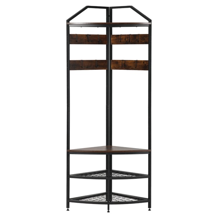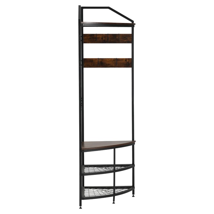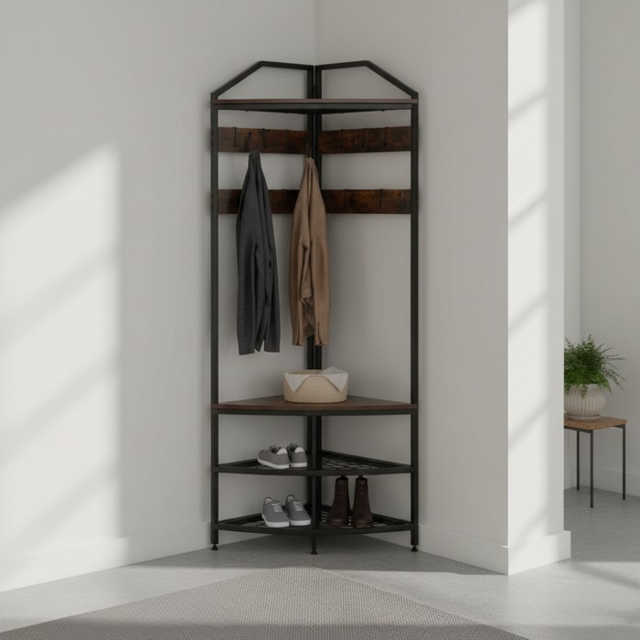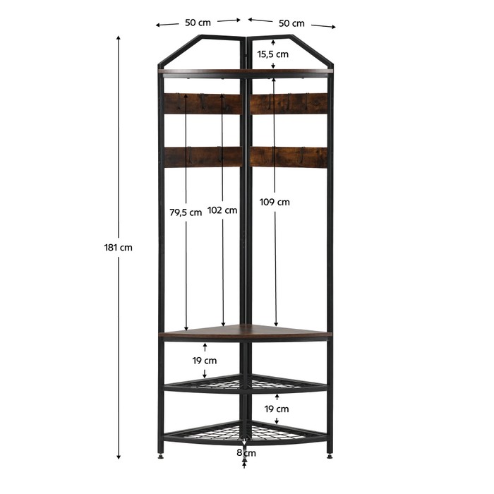 Rohový vešiak ELVIRO je skvelým riešením pre každého, kto chce efektívne využiť nevyužitý roh a zároveň získať štýlový doplnok do predsiene. Poskytuje dostatok priestoru na oblečenie, doplnky aj topánky a vďaka premyslenému dizajnu pôsobí moderne a elegantne. Kombinácia laminovanej MDF v odtieni dub rustikal s čiernou kovovou konštrukciou vytvára atraktívny industriálny vzhľad. Dve MDF police sú ideálne na kabelky či dekorácie, zatiaľ čo dve kovové police poslúžia na prehľadné uloženie topánok. Vešiaková časť ponúka dostatok miesta na kabáty, saká aj šály. Stabilitu zabezpečujú rektifikačné skrutky na nohách, ktoré umožňujú vyrovnanie aj na nerovnom povrchu, vďaka čomu je vešiak praktickým pomocníkom na každodenné používanie. Vešiak je vyrobený z kombinácie kovu a laminovanej MDF v čiernej farbe a odtieni dub rustikal. Má rozmery (ŠxHxV): 50x50x181 cm, pričom hrúbka MDF materiálu je 1,6 cm a výška od zeme po spodnú časť police je 8 cm. Disponuje desiatimi háčikmi, pričom nosnosť jedného háčika je 5 kg. Súčasťou sú dve MDF police s nosnosťou 25 kg a dve kovové police s nosnosťou 10 kg. Vešiak je navrhnutý v jednoduchom industriálnom štýle, je praktický a stabilný vďaka rektifikačným skrutkám na nohách. Nie je vhodný na sedenie, odporúča sa jeho pripevnenie k stene a dodáva sa v demonte.