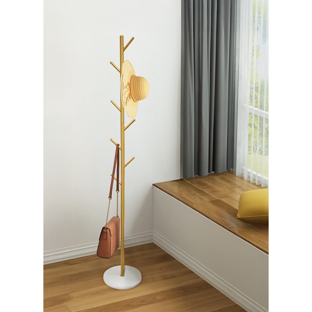 Vešiak TUKAN je elegantný a zároveň praktický doplnok do každého interiéru. Je vyrobený z kovu v zlatej farbe a doplnený o pevnú bielu kamennú základňu, ktorá zaručuje stabilitu aj pri väčšom množstve oblečenia. Vďaka viacerým ramenám poskytuje dostatok priestoru na zavesenie rôznych vecí. Pomáha udržiavať poriadok a zároveň oživí interiér moderným vzhľadom. Vešiak má rozmery (ŠxHxV): 26,5x26,5x173 cm, nosnosť 20 kg a dodáva sa v demontovanom stave.