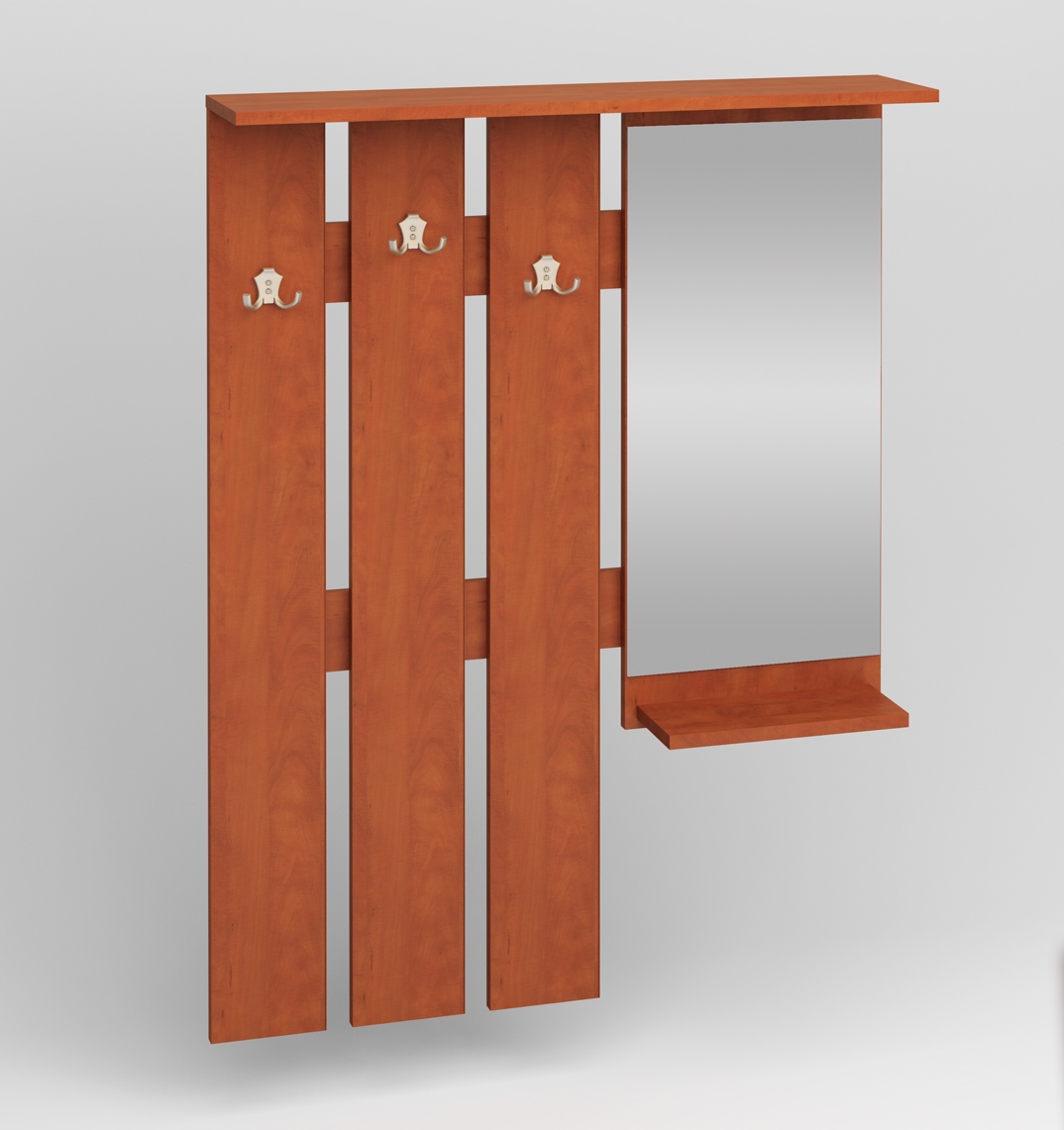 Vešiakový panel so zrkadlom W 90-01 L obsahuje 3 vešiaky na ľavej strane, zrkadlo na pravej strane a praktickú poličku v hornej časti. Vešiakový panel je na výber v ľavom aj v pravom prevedení. Materiál použitý na výrobu je DTD vo farbe hruška, pričom na výber je aj v iných farbách.