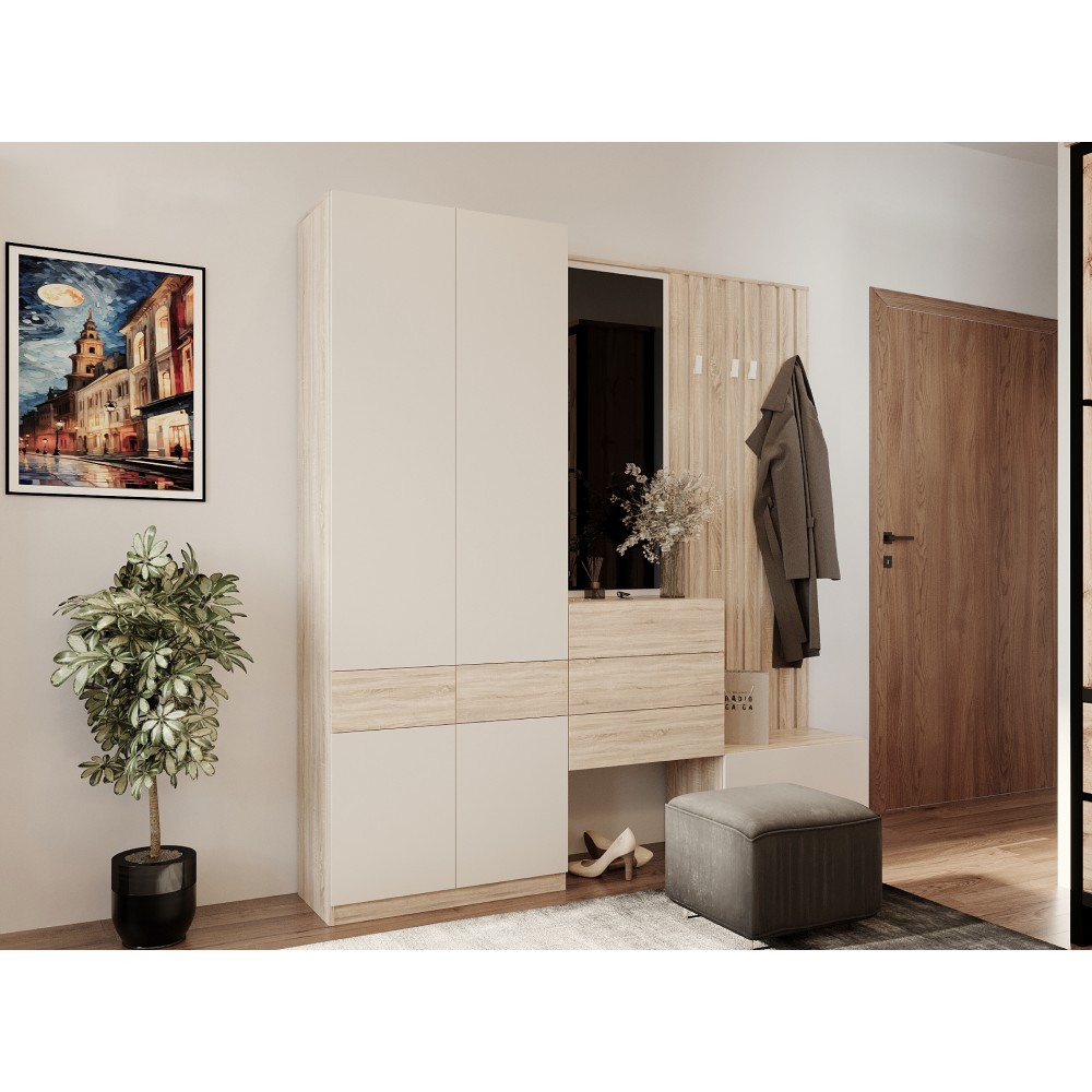 Predsieň je miestom prvého dojmu, preto by mala byť nielen praktická, ale aj štýlová. Predsieňová zostava VERTIO spája moderný dizajn s funkčnými riešeniami a vďaka farebnej kombinácii dub sonoma a kašmír pôsobí elegantne a nadčasovo. Vyrobená je z laminovanej DTD, pričom všetky úložné priestory sú vybavené systémom PUSH UP – bezúchytkové otváranie pre čistý vzhľad. Zostavu si môžete vyskladať podľa vlastných potrieb, keďže komponenty sa objednávajú jednotlivo. Vešiak VERTIO WIE67 s rozmermi (ŠxHxV): 67x3x179 cm je praktickým doplnkom tejto zostavy. Obsahuje štyri strieborné plastové háčiky na kabáty, kabelky či doplnky a ozdobné lamely, ktoré podčiarkujú jeho moderný vzhľad. Vyrobený je z laminovanej DTD s hrúbkou 1,6 - 2,2 cm a odporúča sa pripevnenie na stenu. Dodáva sa v demonte.