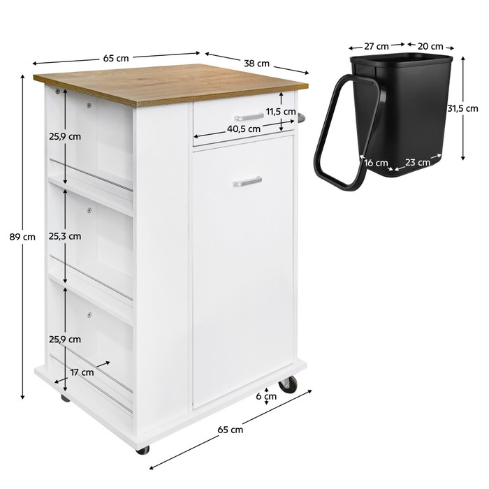 Skrinka VASIN je praktickým a elegantným doplnkom do každej modernej domácnosti. Vyniká kombináciou bielej a dubovej farby, ktorá pôsobí čisto, prirodzene a moderne. Vyrobená je z fóliovanej MDF dosky s hrúbkou 1,2 až 1,5 cm, čo zaručuje pevnosť a dlhú životnosť. S rozmermi (ŠxHxV): 65x38x89 cm poskytuje dostatočný úložný priestor aj v menších miestnostiach. V hornej časti sa nachádza praktický šuplík s kovovými koľajničkami, ktorého vonkajšie rozmery sú 40,5x11,5 cm a vnútorné (ŚxHxV): 36,5x28,7x6,6 cm - ideálny na uloženie hubiek, vreciek či iných drobností. Pod šuplíkom sú výklopné dvierka, za ktorými sa ukrýva odnímateľný plastový odpadkový kôš s objemom 14 litrov. Kôš má rozmery (ŠxHxV): 27x20x31,5 cm a je vybavený krúžkom na uchytenie vrecka, čo zjednodušuje manipuláciu a výmenu. Dvierka sa otvárajú pomocou kovových úchytiek v striebornej farbe, ktoré dodávajú skrinke štýlový vzhľad. Na boku skrinky sa nachádza kovový držiak, ktorý môže slúžiť ako rúčka na presúvanie alebo vešiak na utierky. Okrem toho ponúka aj tri bočné police s kovovými zábranami, vhodné na uloženie čistiacich prostriedkov, kuchynských potrieb alebo kancelárskych doplnkov. Skrinka stojí na štyroch kolieskach s výškou 6 cm, z ktorých dve sú vybavené brzdou pre stabilitu a bezpečné presúvanie. Celková nosnosť skrinky je 20 kg, takže zvládne aj náročnejšie používanie. Skrinka Vasin je viacúčelová - skvele zapadne do kuchyne, kancelárie alebo technickej miestnosti. Dodáva sa v demonte, takže ju jednoducho zložíte podľa priloženého návodu.