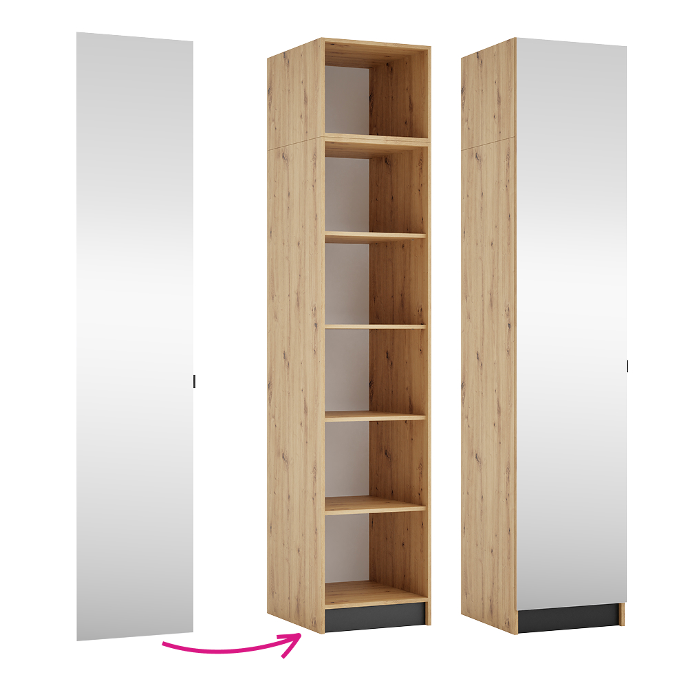 Vysoké dvierka so zrkadlom KREO 50 predstavujú praktické a elegantné riešenie na uzavretie korpusov s nadstavcami a pomáhajú udržať poriadok vo vašom šatníku. Sú vyrobené z laminovanej DTD s ABS hranami a doplnené sklom, pričom majú moderné farebné prevedenie dub artisan. Rozmery dvierok sú (ŠxHxV): 49,6x1,6x229,4 cm a hrúbka DTD materiálu je 1,6 cm, zatiaľ čo ABS hrany majú hrúbku 0,2 cm. Dvierka obsahujú integrované zrkadlo a vďaka univerzálnemu prevedeniu ich môžete namontovať na pravú aj ľavú stranu podľa dispozície miestnosti. Komfort pri používaní zabezpečuje tichý domyk spolu s kvalitnými pántmi. Súčasťou je aj úchytka z plastu v čiernej farbe, ktorá dotvára moderný vzhľad. Dvierka je možné kombinovať s nábytkom v odtieni kašmír a sú vhodné pre korpusy s nadstavcami Kreo 50, 100 a 150. Produkt je dodávaný v demonte, čo uľahčuje transport aj manipuláciu.