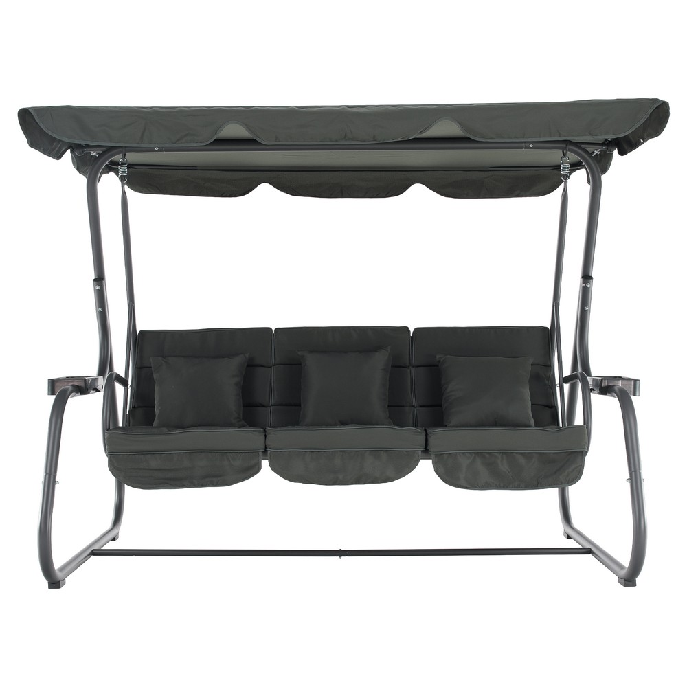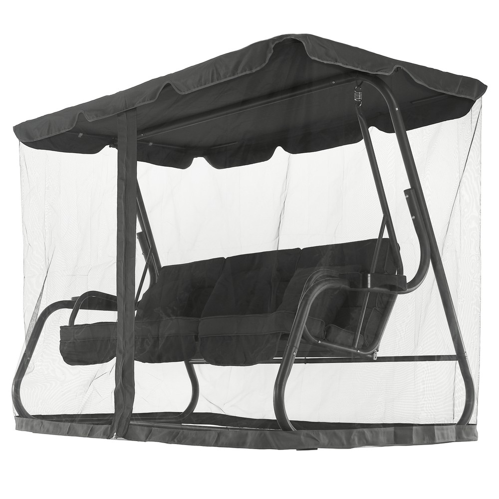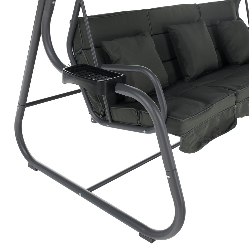 Doprajte si chvíle pokoja s hojdačkou MIJA, ktorá štýlovo obohatí váš exteriér. Jej elegantné tmavosivé prevedenie spolu s mäkkými vankúšmi a odnímateľnými vodoodolnými poťahmi spája moderný vzhľad s funkčnosťou. Poťahy je možné jednoducho ručne vyprať, čo zabezpečuje jednoduchú údržbu. Pevná kovová konštrukcia garantuje stabilitu, zatiaľ čo praktická strieška poskytuje tieň počas slnečných dní. Výnimočným prvkom je integrovaná sieťka proti hmyzu so zapínaním na zips, vďaka ktorej si oddych užijete bez rušivých vplyvov. Na oboch stranách sa nachádzajú odkladacie plochy z odolného plastu, ideálne na nápoje, knihy či drobnosti. Najväčším benefitom je však možnosť premeniť hojdačku na lôžko, čím si vytvoríte ideálne miesto na leňošenie na čerstvom vzduchu. Mija je perfektným doplnkom pre každý vonkajší priestor, ktorý zaručí pohodlie a relax presne podľa vašich predstáv. Celkové rozmery sú (ŠxHxV): 219x130x168 cm, rozmery sedenia (ŠxHxV): 173x50x47/57 cm, výška chrbtovej opierky je 50 cm a celková nosnosť je 200 kg. Rozmery ležania sú 108x173 cm a rozmer striešky je (ŠxV): 219x130 cm.