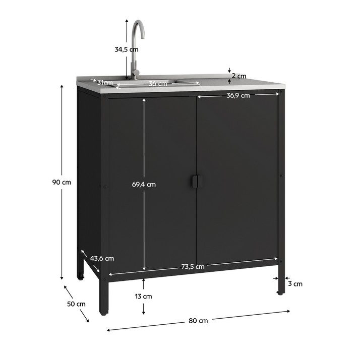 Terasa či záhrada získajú praktického pomocníka v podobe kuchynskej skrinky INES TYP 5, ktorá spája moderný dizajn s funkčnosťou pre každodenné používanie v exteriéri. Elegantná kombinácia čiernej a striebornej farby pôsobí nadčasovo a jednoducho sa zladí s rôznymi štýlmi vonkajšieho zariadenia. Konštrukcia z nehrdzavejúcej ocele s práškovým lakovaním zabezpečuje pevnosť, stabilitu a odolnosť voči korózii aj nepriaznivým poveternostným podmienkam. Pracovná plocha s rozmermi (ŠxHxV): 80x50x92 cm poskytuje dostatočný priestor na prípravu jedál, pričom celková nosnosť dosahuje 30 kg. Úložný priestor dopĺňajú praktické dvierka, ktoré ponúkajú úložný priestor v podobe skrinky s policou. Polica má hmotnosť 20 kg a je vhodná na uloženie kuchynského príslušenstva. Stabilitu zvyšuje pevný rám a rektifikačné skrutky na nohách, ktoré umožňujú vyrovnanie aj na mierne nerovnom povrchu. Hrúbka materiálu sa pohybuje od 0,6 do 1,2 mm. Súčasťou skrinky je drez s rozmerami (ŠxHxV): 38x33x17,5 cm, ktorý uľahčuje prípravu jedál a umývanie surovín alebo riadu. Jeho vnútorné rozmery sú (ŠxHxV): 32x27x16. Skrinka je navrhnutá na vonkajšie použitie, ideálne k bazénu, do altánku, na terasu alebo do záhrady. Odporúča sa umiestniť ju na pevný a rovný podklad, napríklad na betón alebo dlažbu, a zabezpečiť prístup k vodovodnému systému. Povrch nie je vhodný na odkladanie horúcich predmetov a výrobok by mal byť umiestnený mimo zdrojov tepla, ako je gril alebo ohnisko. Údržba je nenáročná - prach stačí zotrieť mäkkou handričkou a povrch čistiť jemným čistiacim prostriedkom alebo mydlovou vodou. V exteriéri sa odporúča chrániť výrobok ochrannou plachtou a po sezóne ho skladovať v suchej a chladnej miestnosti. Ostrovček možno kombinovať s ďalšími prvkami série Ines alebo doplniť o kompletnú hotovú záhradnú kuchyňu Ines. Dodáva sa v demonte.