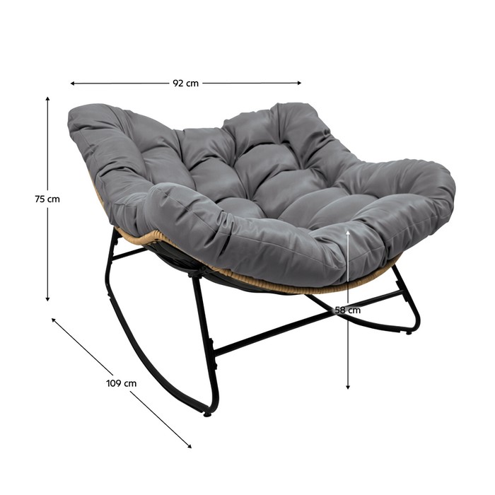 Záhradné hojdacie kreslo DEVNER je ideálnou voľbou pre všetkých, ktorí si chcú vytvoriť pohodlné miesto na oddych v záhrade, na terase alebo balkóne. Moderná kovová konštrukcia v čiernej farbe je doplnená hnedým ratanovým výpletom, ktorý pôsobí prirodzene a elegantne. O maximálny komfort sa stará mäkký sivý vankúš, vďaka ktorému si môžete vychutnať príjemné hojdanie a chvíle relaxu po náročnom dni. Kreslo je stabilné, pevné a zároveň navrhnuté tak, aby poskytovalo pohodlie pri každodennom používaní. Kreslo je vyrobené z kovu, ratanu a látky, pričom textília dosahuje oderuodolnosť 95 000 Martindale cyklov. Rozmery kresla sú (ŠxHxV): 92x109x75 cm. Výška sedu bez vankúša je 42 cm a s vankúšom 58 cm, pričom šírka sedu je 92 cm a hĺbka sedu 109 cm. Nosnosť kresla je 90 kg. Súčasťou je vankúš s rozmermi 120x120 cm a hrúbkou 16 cm, ktorý má snímateľný vodoodolný poťah prateľný pri teplote do 30 °C. Kreslo je vhodné do interiéru aj exteriéru, pričom pri používaní vonku sa odporúča chrániť ho pred nepriaznivými poveternostnými vplyvmi, ako sú silný dážď, vietor, krupobitie alebo intenzívne slnečné žiarenie. Pre dlhšiu životnosť je vhodné použiť ochranný kryt alebo plachtu. Poťah nebieliť, nesušiť v sušičke, nežehliť ani chemicky nečistiť. Kreslo sa dodáva v demonte.