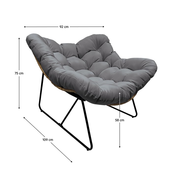 Záhradné kreslo DEVNER TYP 2 je štýlovým a pohodlným doplnkom, ktorý spríjemní chvíle oddychu na terase, balkóne či v záhrade. Moderné prevedenie v kombinácii čiernej kovovej konštrukcie a hnedého ratanového výpletu pôsobí elegantne a nadčasovo, takže kreslo ľahko zapadne do rôznych typov exteriérov aj interiérov. Mäkký sivý vankúš zabezpečuje príjemné a pohodlné sedenie, vďaka čomu si môžete vychutnať pokojné chvíle relaxu počas celého dňa. Stabilná kovová podnož dodáva kreslu pevnosť a spoľahlivú oporu pri každodennom používaní. Kreslo je vyrobené z kovu, ratanu a látky, pričom použitá textília dosahuje oderuodolnosť 95 000 Martindale cyklov, čo zaručuje jej vysokú odolnosť. Farebné prevedenie je čierna / hnedá / sivá. Rozmery kresla sú (ŠxHxV): 92x109x75 cm. Výška sedu bez vankúša je 42 cm a s vankúšom 58 cm, pričom šírka sedu je 92 cm a hĺbka sedu 109 cm. Nosnosť kresla je 90 kg. Súčasťou kresla je vankúš s rozmermi 120x120 cm a hrúbkou 16 cm. Poťah vankúša je snímateľný, vodoodolný a prateľný pri teplote do 30 °C. Pri údržbe sa odporúča nebieliť, nesušiť v sušičke, nežehliť ani nečistiť chemicky. Kreslo je vhodné do interiéru aj exteriéru, pričom pri vonkajšom používaní sa odporúča chrániť ho pred nepriaznivými poveternostnými vplyvmi, ako je silný dážď, vietor, krupobitie či intenzívne slnečné žiarenie, prípadne použiť ochranný kryt alebo plachtu. Dodáva sa v demonte.