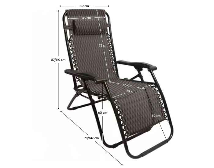 Doprajte si luxusný relax v pohodlí vášho domova. Každá chvíľa oddychu si zaslúži dokonalé miesto a lehátko GAVIN je presne tým, čo potrebujete. Navrhnuté tak, aby vám poskytlo maximálny komfort pri oddychu na slnku, pri bazéne či v záhrade. Vyrobená je z pevnej oceľovej konštrukcie a umelej textílie v sivohnedom vzore. O komfort počas sedenia a relaxácie sa postará mäkká opierka hlavy. Relax pre unavené ruky zabezpečia praktické opierky. Lehátko disponuje funkciou polohovania, ktorá umožní nastavenie sklonu podľa vašich potrieb. Rozmery lehátka sú (ŠxHxV): 57x70/147x87/110 cm, rozmery po zložení (ŠxHxV): 57x15x90 cm. Rozmery sedenia sú (ŠxHxV): 47x46x50 cm. Výška chrbtovej opierky je 75 cm a šírka 43 cm. S lehátkom Gavin si vychutnáte každý relax.