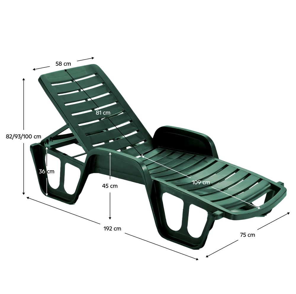 Užite si dokonalý relax s lehátkom LETNO, ktoré sa stane vaším obľúbeným spoločníkom pri odpočinku na záhrade, terase alebo pri bazéne. Je vyrobené z vysokokvalitného plastu, ktorý zaručuje pevnosť, odolnosť a jednoduchú údržbu aj pri každodennom používaní. Jeho štýlový zelený odtieň sa harmonicky začlení do akéhokoľvek exteriéru. Lehátko ponúka štvornásobné nastavenie polohy operadla, takže si pohodlie môžete prispôsobiť presne podľa seba - či už sa opaľujete, čítate alebo len oddychujete. Vďaka úspornému stohovateľnému dizajnu nezaberie veľa miesta pri skladovaní a jeho manipulácia je úplne bezproblémová. Celkové rozmery sú (ŠxHxV): 751x192x82/93/100 cm a nosnosť predstavuje 110 kg.