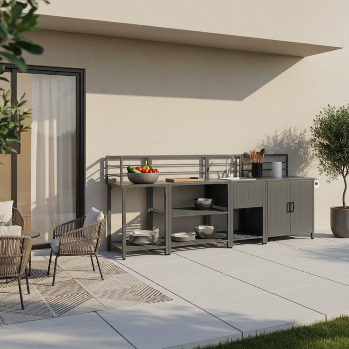 Doprajte si praktické riešenie pre varenie a prípravu jedál na čerstvom vzduchu. Záhradný kuchynský ostrovček TANITA TYP 2 vytvára funkčný pracovný priestor s dostatkom miesta na odkladanie aj manipuláciu so surovinami. Je vyrobený z nehrdzavejúcej ocele s práškovým lakovaním v kombinácii sivej a striebornej farby, čo zabezpečuje odolnosť voči korózii, vlhkosti aj UV žiareniu. Stabilná konštrukcia s rozmermi (ŠxHxV): 60x62x125,5 cm poskytuje komfortnú pracovnú výšku a spoľahlivú oporu pri každodennom používaní v exteriéri. Súčasťou ostrovčeka je integrovaný drez s rozmermi (ŠxHxV): 42x42x20 cm a vnútorným priestorom (ŠxHxV): 36,8x36,8x20 cm, ktorý umožňuje pohodlné oplachovanie potravín alebo riadu priamo počas varenia. Pracovná plocha z nehrdzavejúcej ocele je hygienická, ľahko sa udržiava a odoláva poveternostným podmienkam. Hrúbka materiálu 0,4 - 1 mm prispieva k pevnosti, pričom celková nosnosť ostrovčeka dosahuje 50 kg. Pod pracovnou plochou sa nachádza praktická polica s nosnosťou 25 kg, ktorá ponúka priestor na uloženie kuchynského vybavenia. Ochranná zábrana pomáha udržať veci na mieste a rektifikačné skrutky na nohách umožňujú jednoduché vyrovnanie na rôznych typoch povrchov. Konštrukcia je navrhnutá na vonkajšie použitie a vďaka odolnosti voči vetru, nečistotám a vyblednutiu si zachováva svoj vzhľad aj pri dlhodobom umiestnení na záhrade, terase, pri bazéne alebo v altánku. Pre optimálnu stabilitu sa odporúča umiestniť ostrovček na pevný a rovný podklad. Počas používania je vhodné neukladať na pracovnú plochu horúce predmety a chrániť výrobok pred extrémnymi poveternostnými podmienkami. Údržba je jednoduchá – prach stačí utrieť mäkkou handričkou a povrch očistiť jemným čistiacim prostriedkom alebo mydlovou vodou. Po skončení sezóny sa odporúča skladovanie v suchom prostredí alebo prekrytie ochrannou plachtou. Model je možné kombinovať s ďalšími modulmi série Tanita alebo ho doplniť o kompletnú zostavu záhradnej kuchyne. Dodáva sa v demonte. Súčasťou balenia je jednopáková vodovodná batéria na miešanie teplej a studenej vody s možnosťou pripojenia na štandardnú hadicu, ako aj sifónová a odtoková hadica pre jednoduchú montáž.