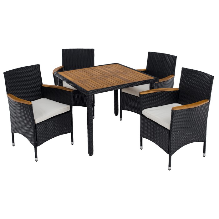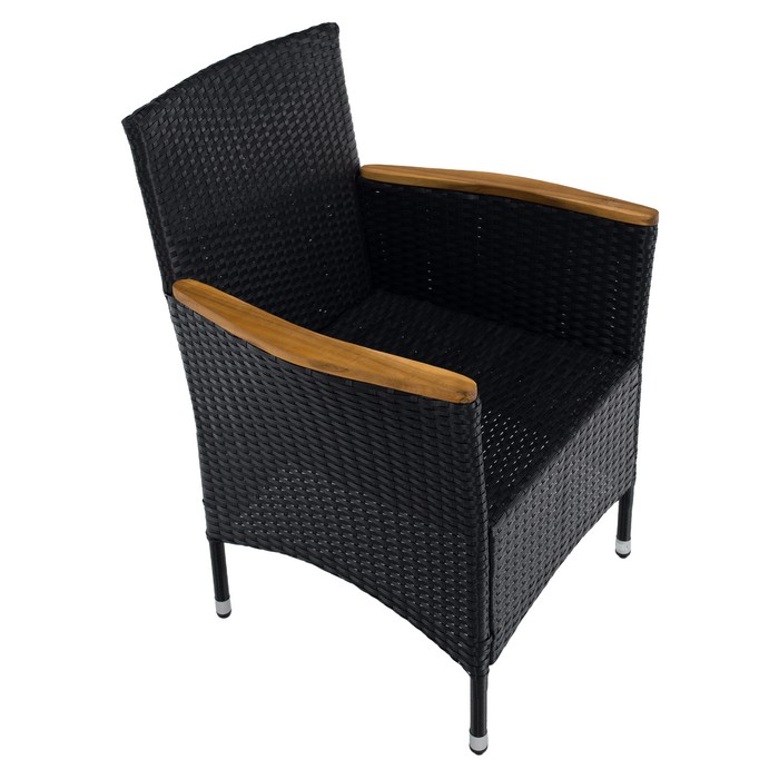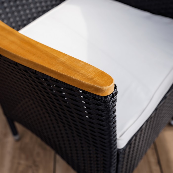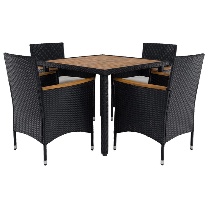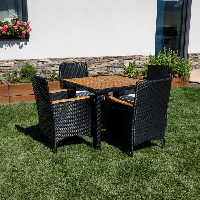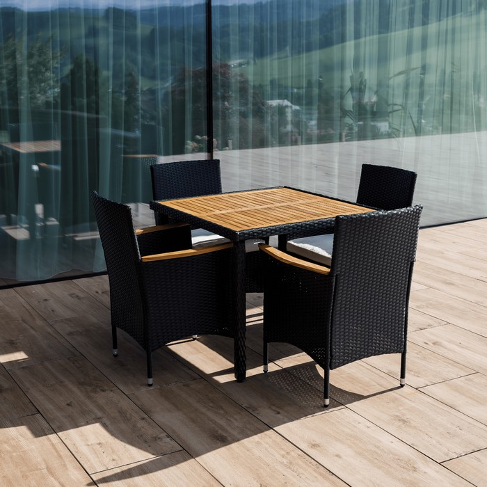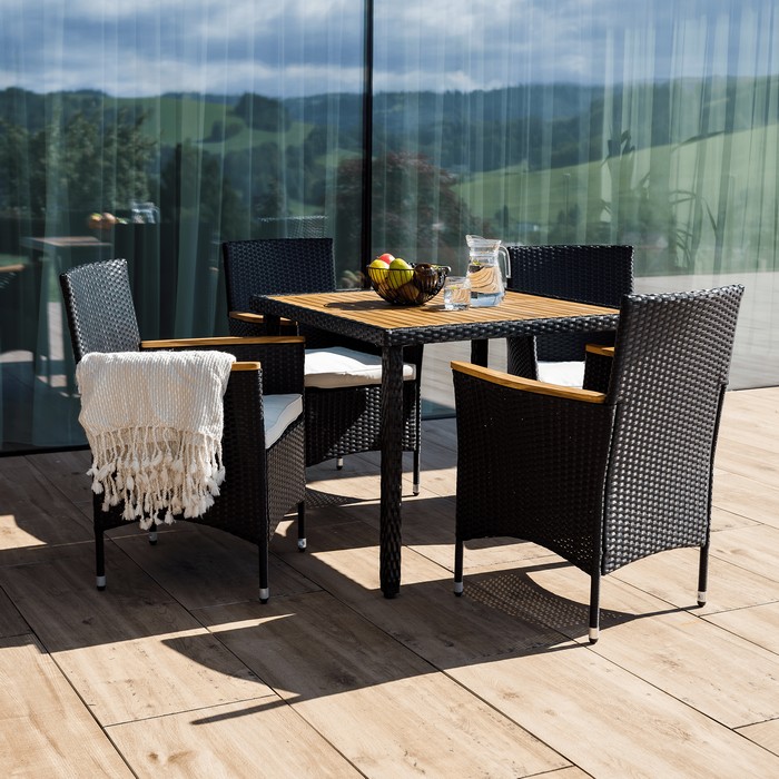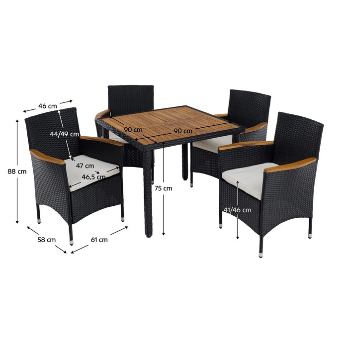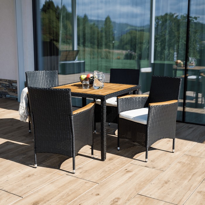 BOGART je elegantný záhradný nábytok, ktorý pôsobí vkusne a moderne. Vyrobený je z oceľovej konštrukcie a umelého ratanu v čiernej farbe. Opierky na kreslách a stolová doska sú doplnené o materiál v podobe masívneho akáciového dreva v prírodnom prevedení. Záhradný nábytok pozostáva zo štyroch kresiel s rozmermi (ŠxHxV): 61x58x88 cm so šírkou a hĺbkou sedu 46,5 cm. Dodávané sú s vankúšmi v krémovom prevedení s hrúbkou 5 cm. Poťah je vodeodolný a snímateľný s možnosťou prania pri teplote 30°C. Maximálna nosnosť na osobu je 90 kg. Dodávaný je v demonte.