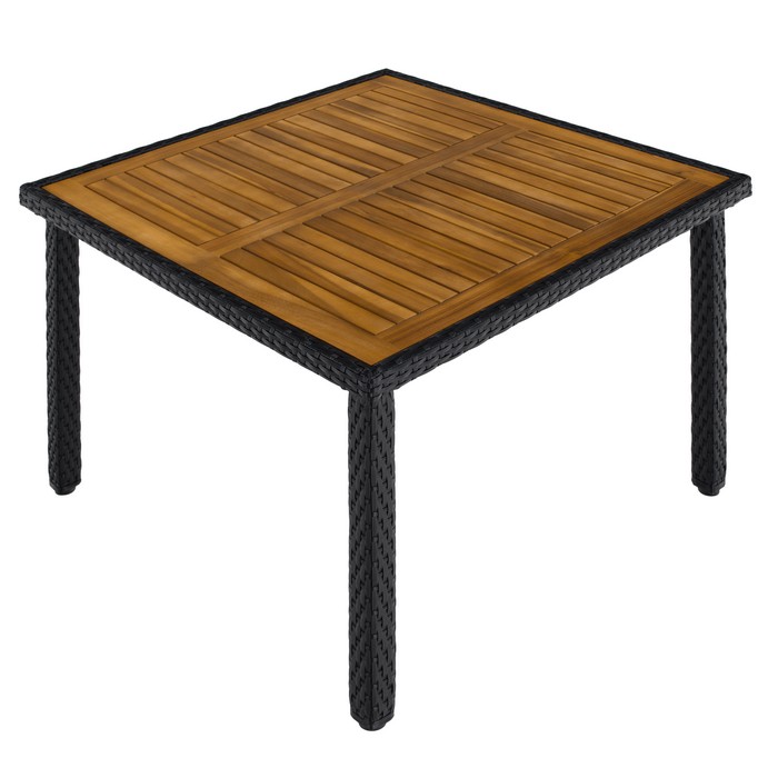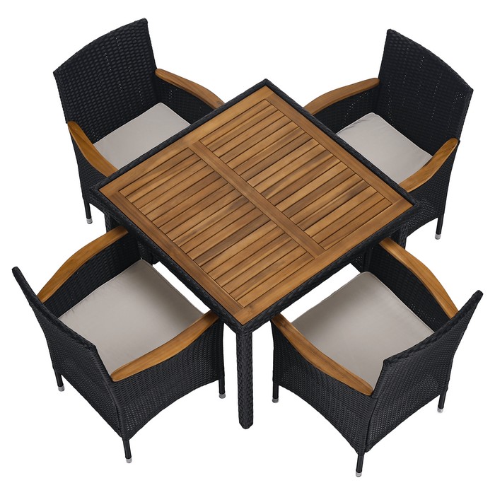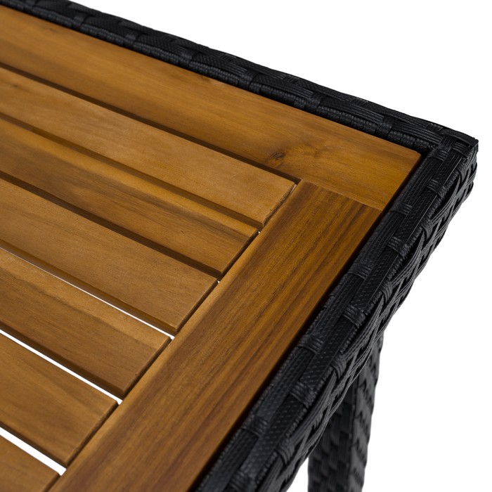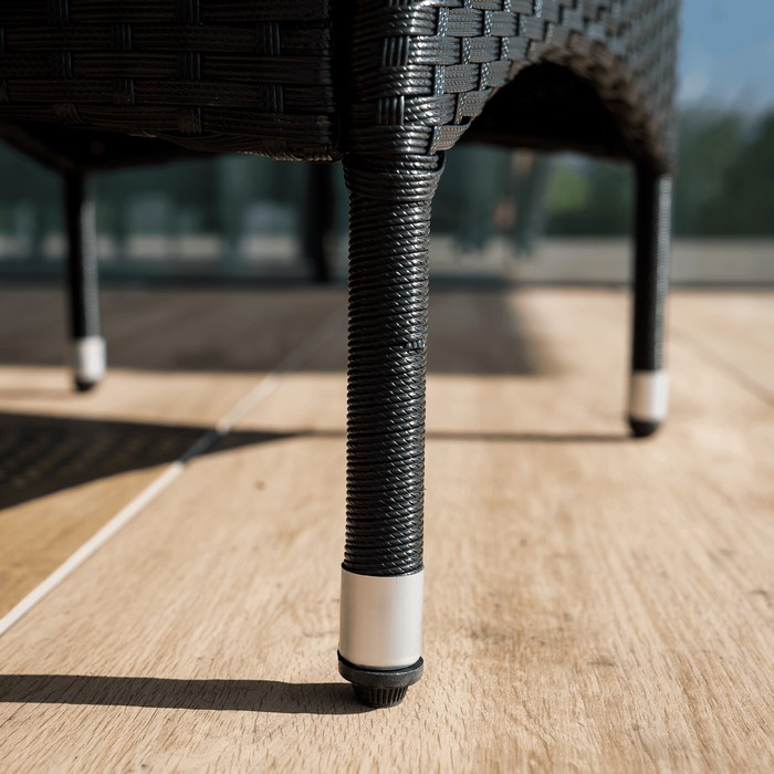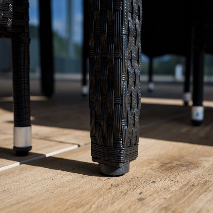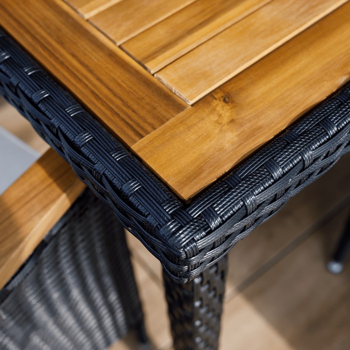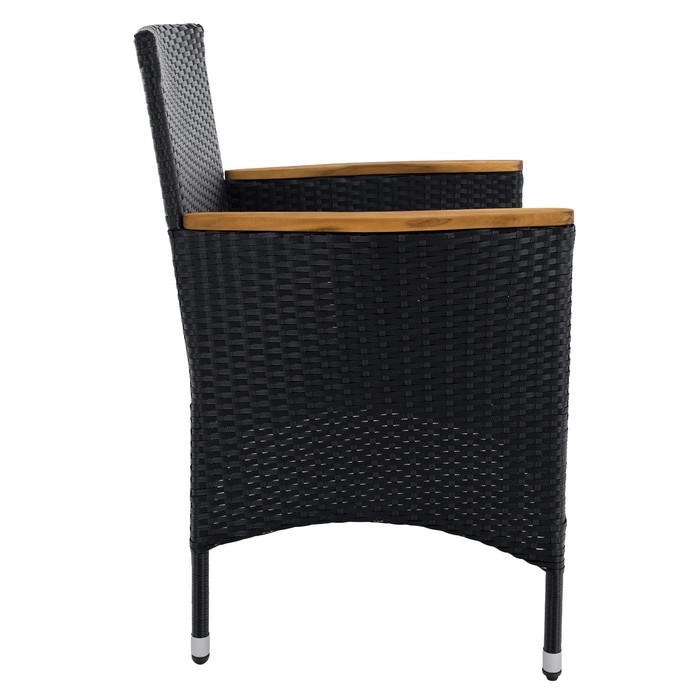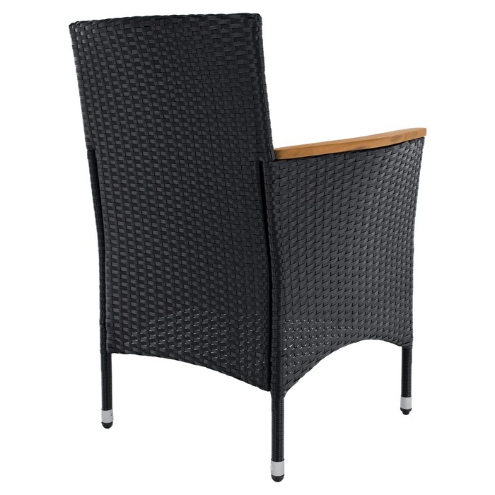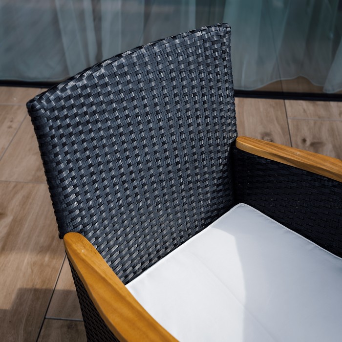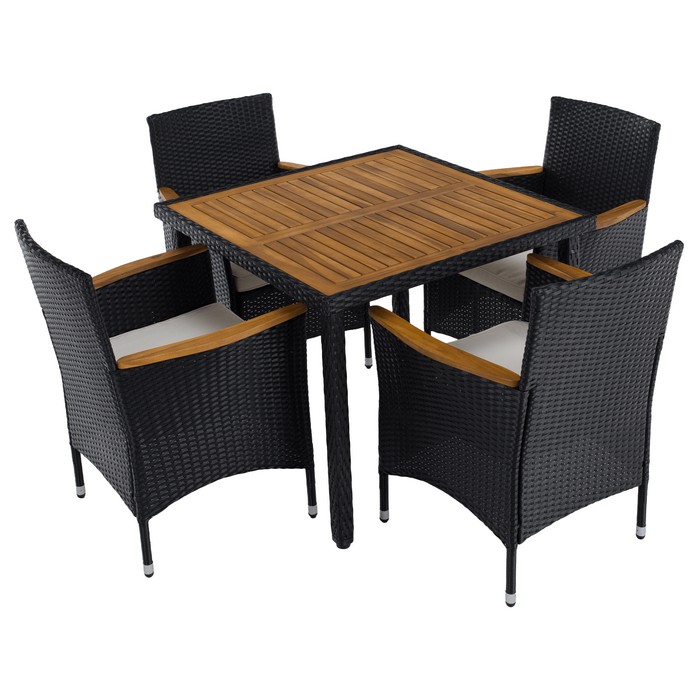 BOGART je elegantný záhradný nábytok, ktorý pôsobí vkusne a moderne. Vyrobený je z oceľovej konštrukcie a umelého ratanu v čiernej farbe. Opierky na kreslách a stolová doska sú doplnené o materiál v podobe masívneho akáciového dreva v prírodnom prevedení. Záhradný nábytok pozostáva zo štyroch kresiel s rozmermi (ŠxHxV): 61x58x88 cm so šírkou a hĺbkou sedu 46,5 cm. Dodávané sú s vankúšmi v krémovom prevedení s hrúbkou 5 cm. Poťah je vodeodolný a snímateľný s možnosťou prania pri teplote 30°C. Maximálna nosnosť na osobu je 90 kg. Dodávaný je v demonte.