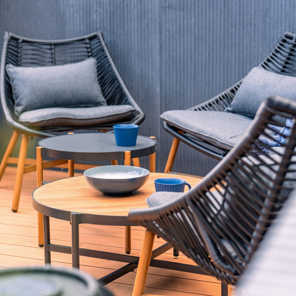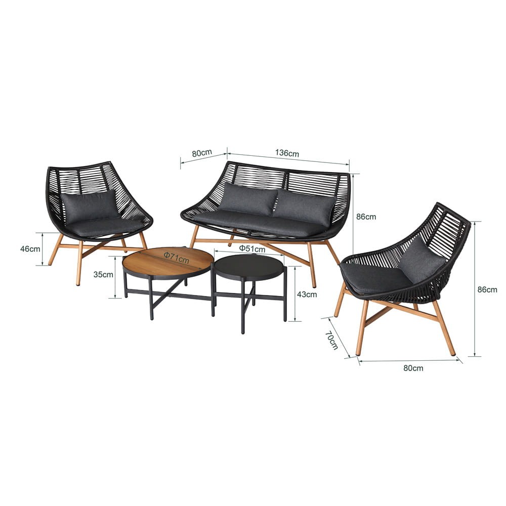 Záhradný kávový set HALDON CS je elegantná a praktická súprava určená pre štyri osoby, ktorú tvorí dvojmiestna pohovka s rozmermi (ŠxHxV): 136x80x86 cm, dve pohodlné kreslá veľkosti (ŠxHxV): 73/76x80x86 cm a dva stolíky – jeden s rozmermi (ŠxHxV): 71x35 cm a druhý (ŠxHxV): 51x43 cm. Celá konštrukcia je vyrobená z odolného hliníka, ktorý zaručuje stabilitu a dlhodobú pevnosť nábytku. Sedacie časti sú vypletené z kvalitného polyratanu, ktorý výborne odoláva nepriaznivému počasiu, a o maximálne pohodlie sa starajú mäkké vankúše zo spriadaného polyesteru s vyššou odolnosťou proti vlhkosti. Stolové dosky sú vyrobené z kombinácie kompozitného materiálu a tvrdeného skla, čo zabezpečuje jednoduchú údržbu a praktickosť pri každodennom používaní. Maximálne zaťaženie pohovky je 220 kg a každé kreslo unesie hmotnosť do 110 kg. Celkový dizajn súpravy v kombinácii čiernej, antracitovej - sivej a drevenej farby pôsobí moderne a zároveň nadčasovo, vďaka čomu sa hodí nielen do záhrady či na terasu, ale aj do interiéru. Haldon CS sa stane jedinečným miestom Vašej záhrady, v ktorej sa budete cítiť pohodlne a príjemne. Pohodlne sa usaďte, uvoľnite sa a vychutnávajte si spoločné chvíle s rodinou a priateľmi počas dlhých, teplých letných dní.