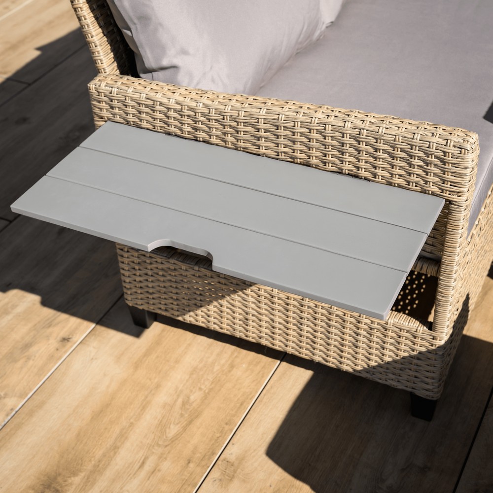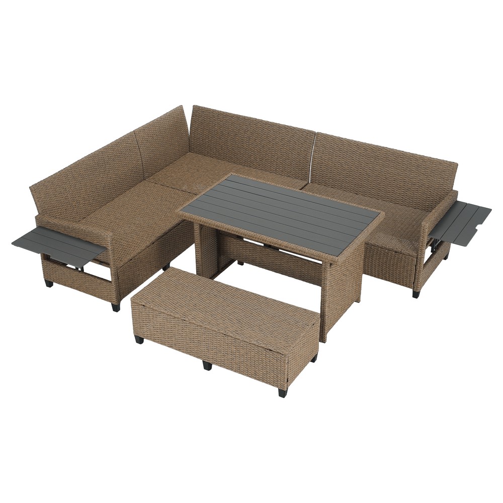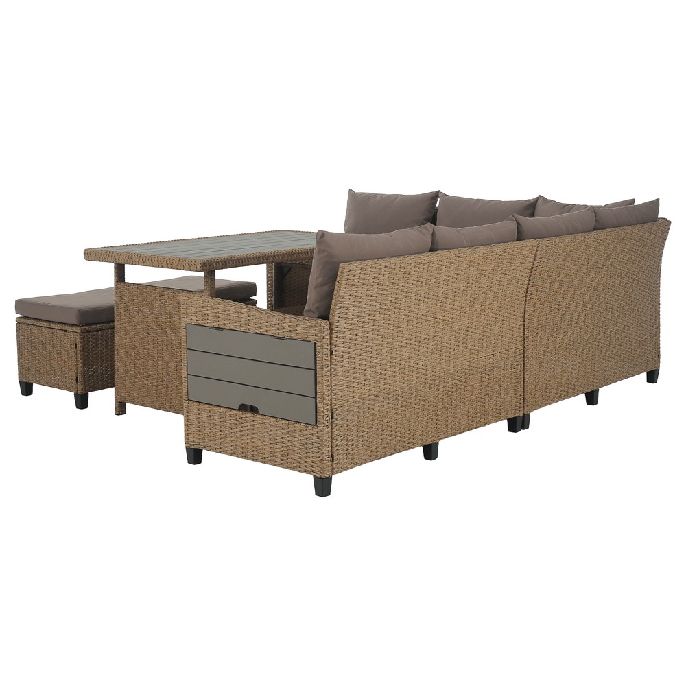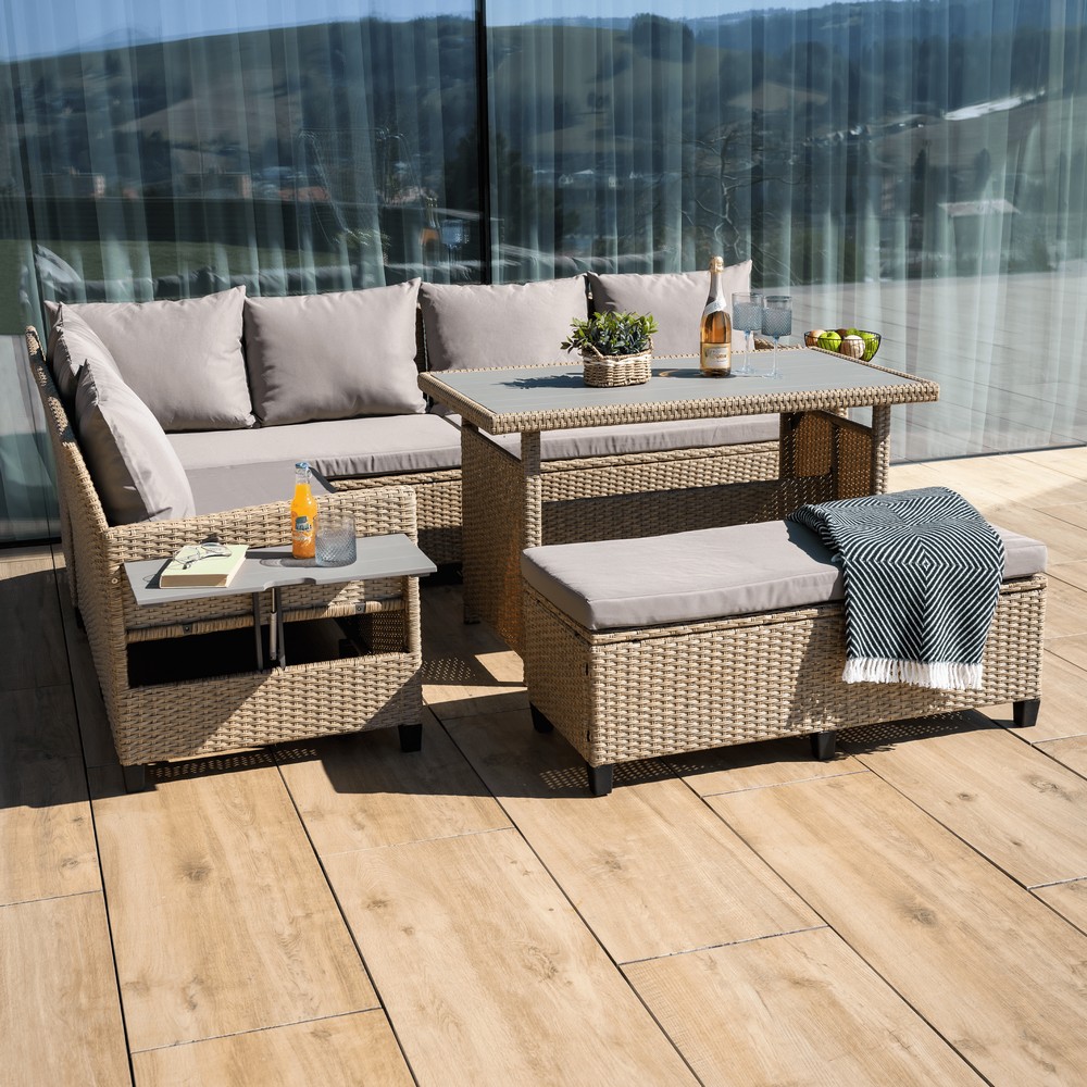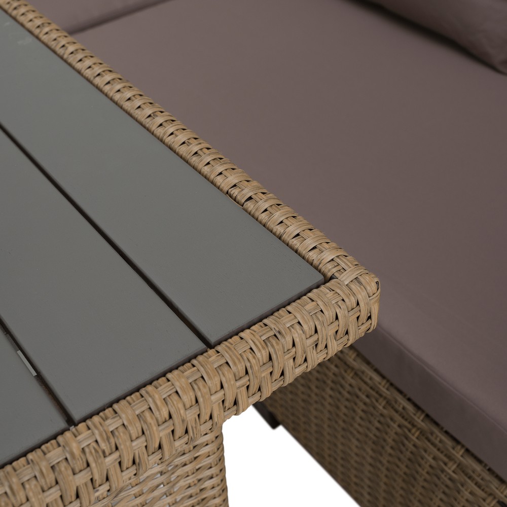 Záhradný nábytok TAGULA je tým pravým doplnkom pre vašu záhradu. Pozostáva z troch dielov v podobe rohu, lavice a jedálenského stola. Vyrobený je z oceľovej konštrukcie, umelého ratanu v príjemnej svetlohnedej farbe. Stolová doska a sklápacie príručné stolíky nachádzajúce sa na boku rohovej časti sú z materiálu polywood. Súčasťou sú aj vankúše v sivom prevedení s hrúbkou 6,5 cm. Sú vodeodolné a snímateľné s možnosťou prania pri teplote 30°C. Celkové rozmery roh (ŠxHxV): 244x192/72x76 cm, lavica (ŠxHxV): 110x45x41,5 cm, stôl (ŠxHxV): 120x70x69 cm. Maximálna nosnosť na osobu je 90 kg. Dodávané v demonte.
