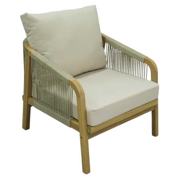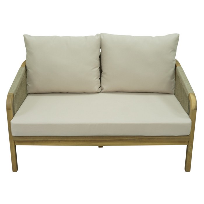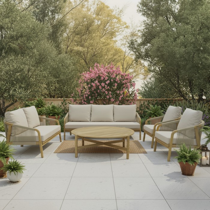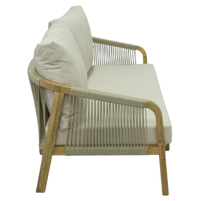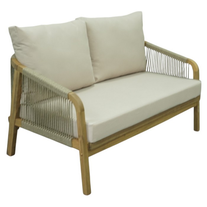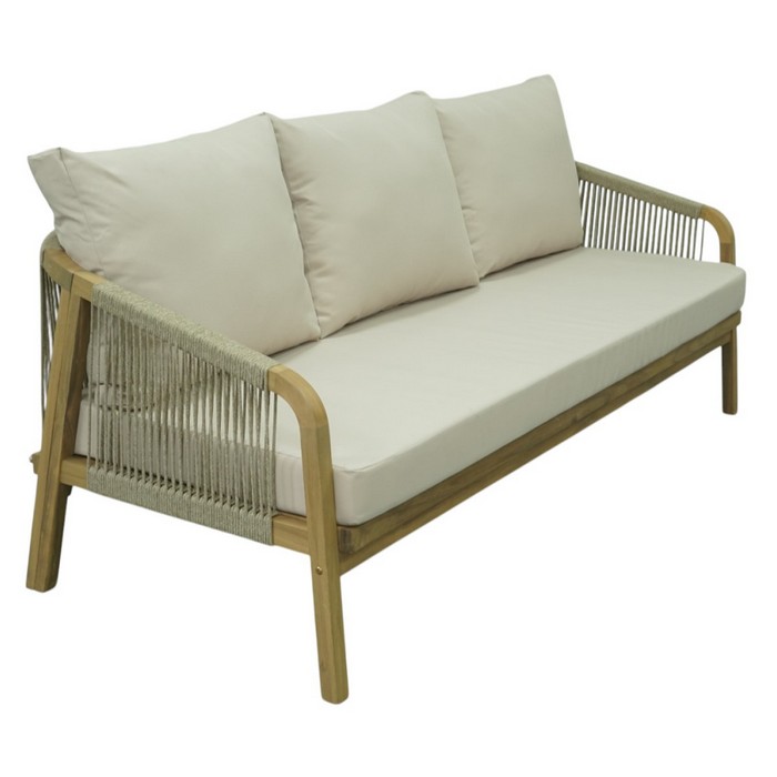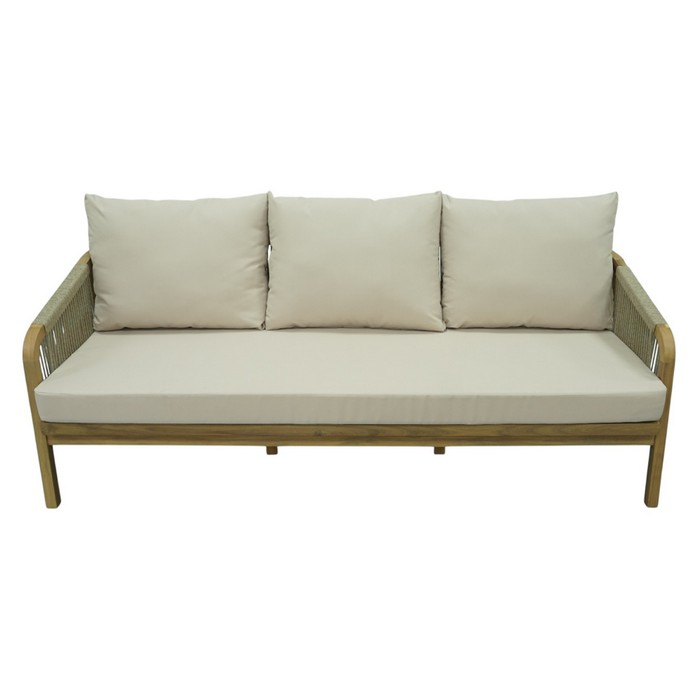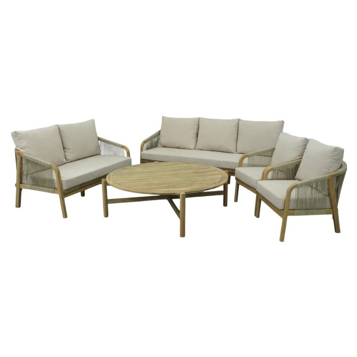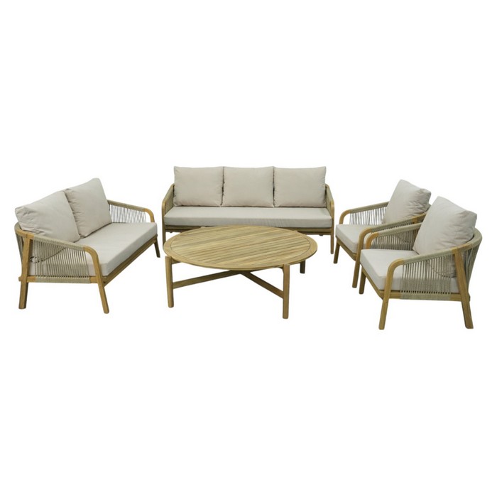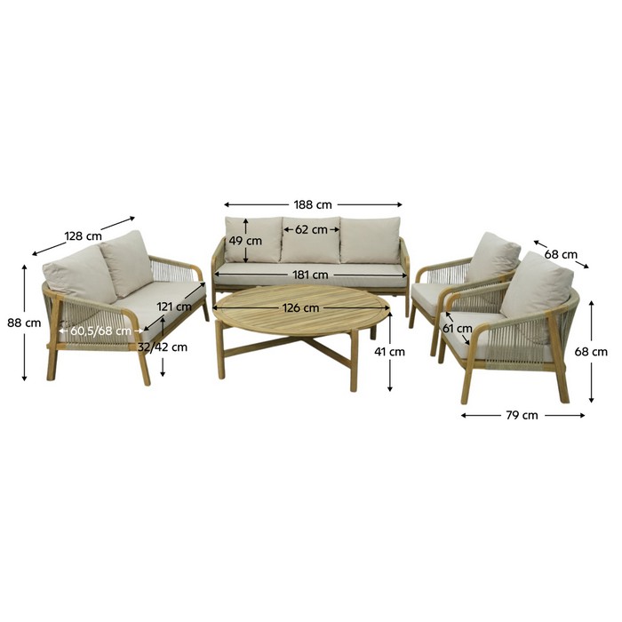 Záhradný 5-dielny set NARSI je ideálny na vytvorenie príjemného miesta na oddych na terase, v záhrade alebo na priestrannom balkóne. Kombinuje prirodzenú krásu masívneho akáciového dreva v prírodnom odtieni s béžovou látkou a lanovým výpletom, čo mu dodáva elegantný a vzdušný vzhľad. Vďaka pevnej konštrukcii však pôsobí zároveň stabilne a odolne, takže je vhodný na každodenné používanie v exteriéri. Súprava pozostáva z piatich častí - 3-miestnej pohovky, 2-miestnej pohovky, dvoch kresiel a konferenčného stolíka. Trojsed má rozmery (ŠxHxV): 188x79x68/88 cm, dvojsed (ŠxHxV): 128x79x68/88 cm a kreslo (ŠxHxV): 68x79x68/88 cm. Konferenčný stolík má priemer 126 cm a výšku 41 cm. Výška sedu bez vankúša je 32 cm a s vankúšom 42 cm. Hĺbka sedu bez vankúša je 68 cm a s vankúšom 60,5 cm. Šírka sedacej časti je 181 cm pri trojsede, 121 cm pri dvojsede a 61 cm pri kresle. O pohodlie pri sedení sa starajú mäkké sedáky s hrúbkou 10 cm a chrbtové vankúše s rozmermi (ŠxHxV): 62x7,5x49 cm, ktoré poskytujú príjemnú oporu chrbtu. Výška chrbtovej opierky je 30 cm. Poťahy na vankúšoch sú snímateľné, vodoodolné a možno ich prať pri teplote 30 °C. Textília má vysokú odolnosť voči oderu podľa testu Martindale až 95 000 oderov. Nosnosť je 90 kg na osobu a stolík unesie až 50 kg. Záhradný set je tak praktickou aj štýlovou voľbou pre vonkajšie posedenia s rodinou či priateľmi. Súprava sa dodáva s vankúšmi a v demonte.